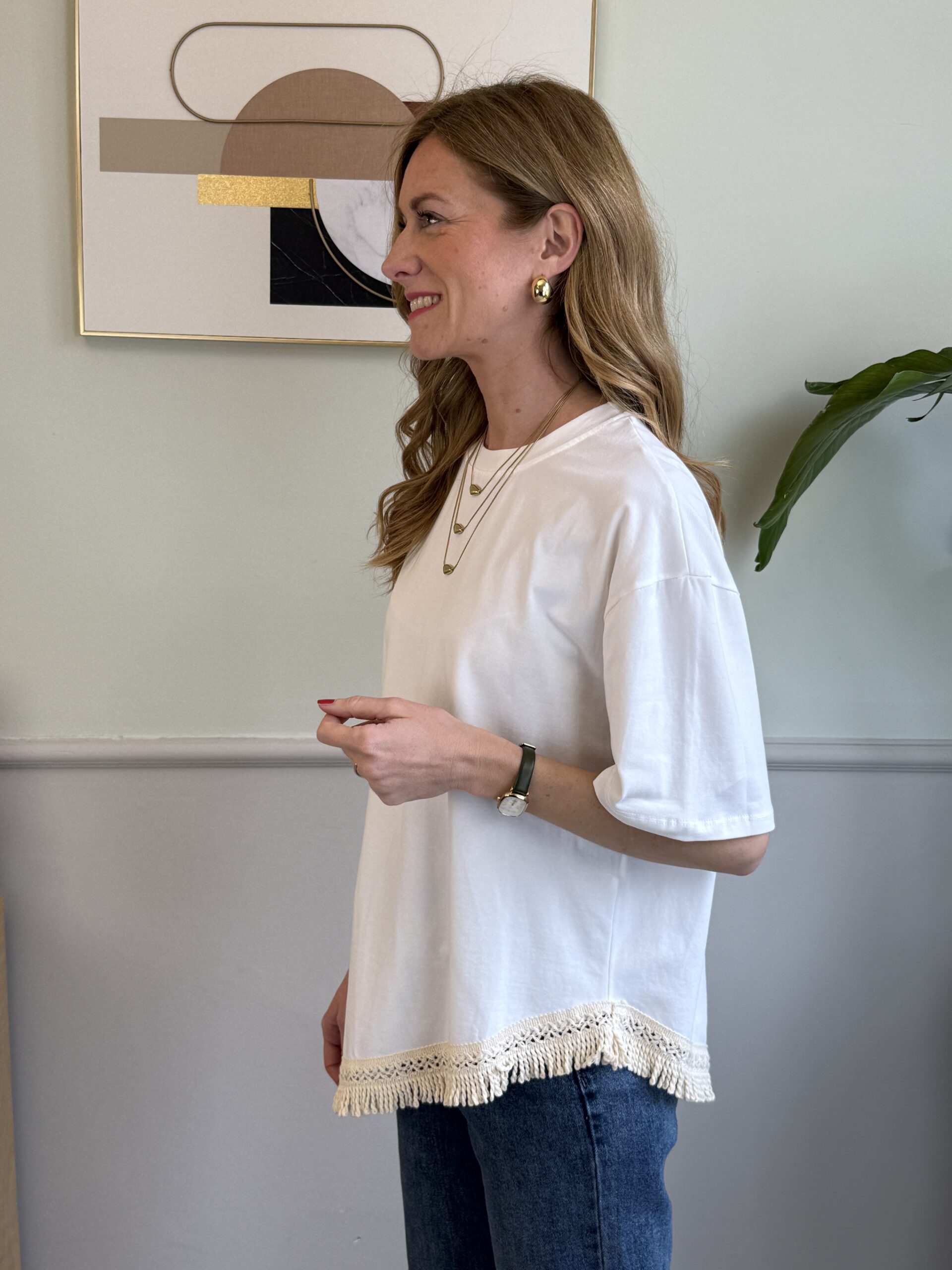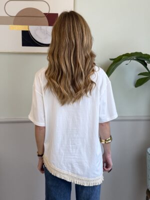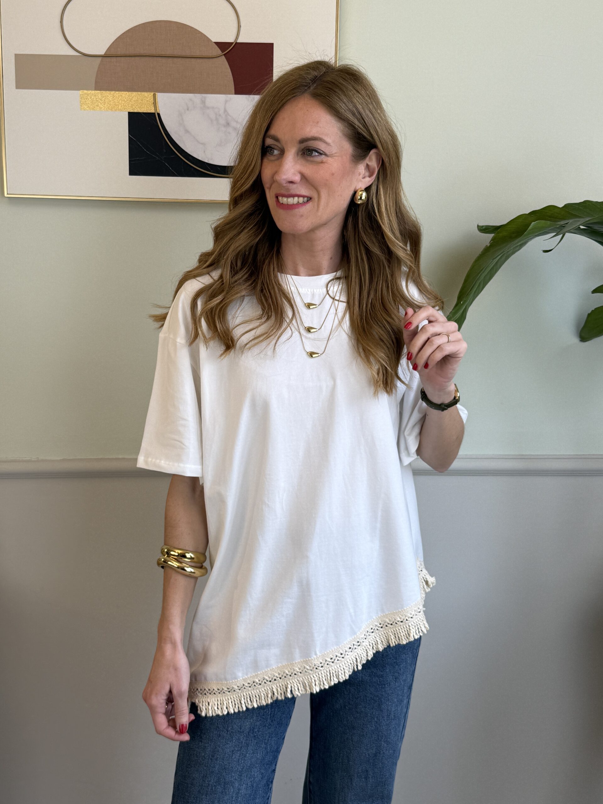 T-shirt panna con orlo asimmetrico in passamaneria beige, girocollo e spalla scesa.