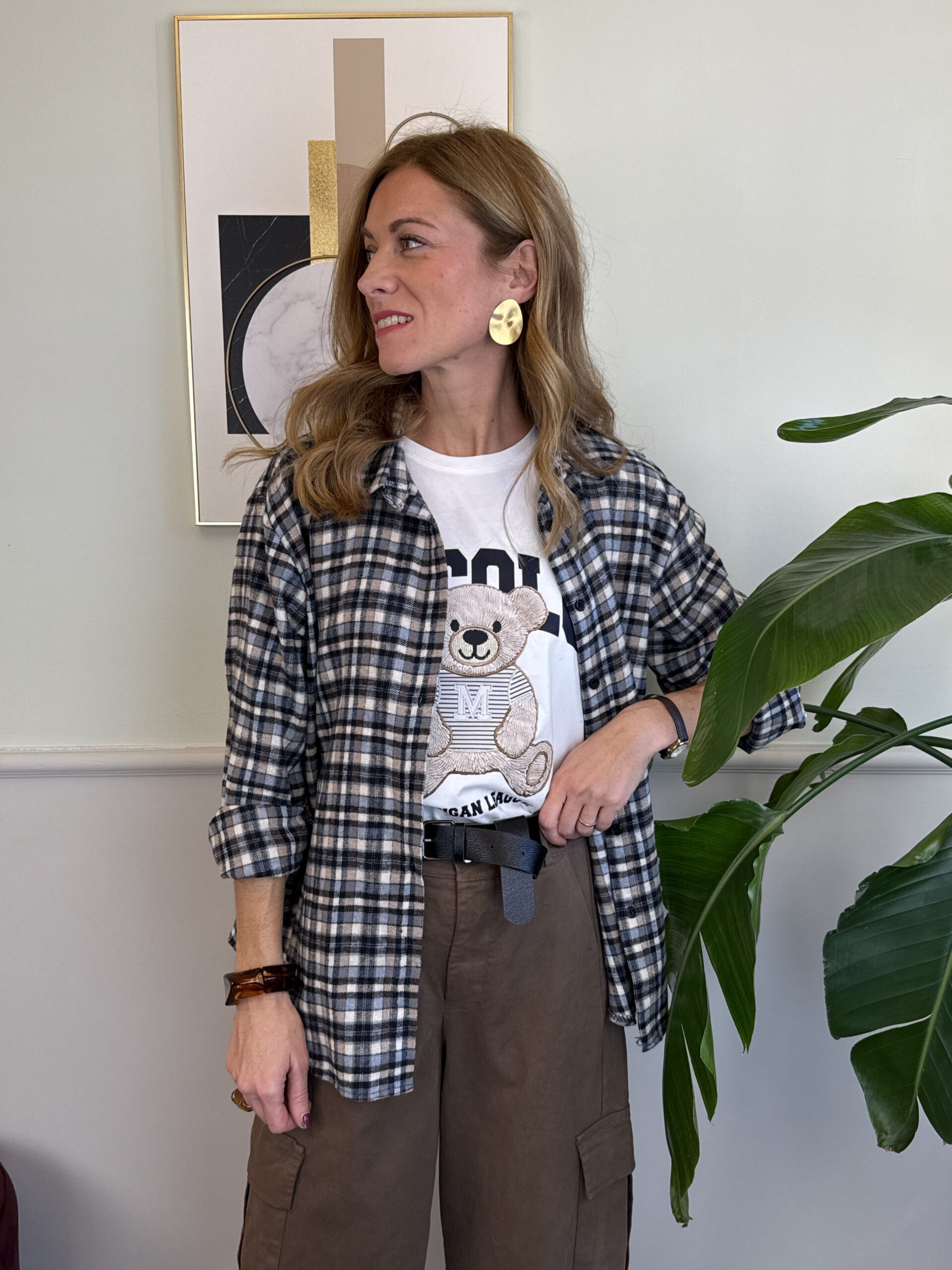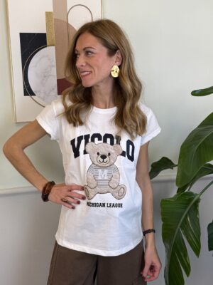 T-shirt bianca in cotone girocollo con stampa orsetto e scritta.