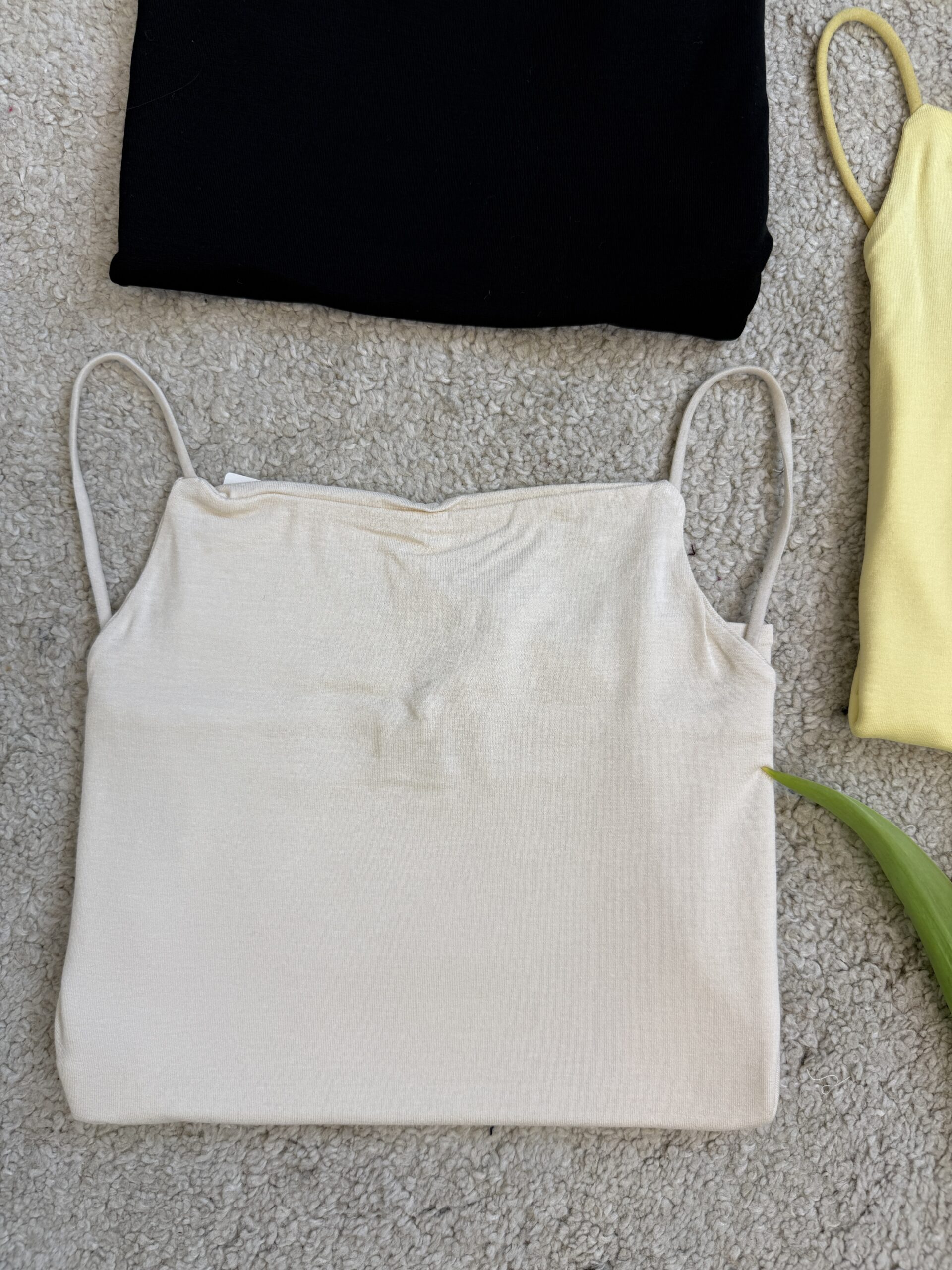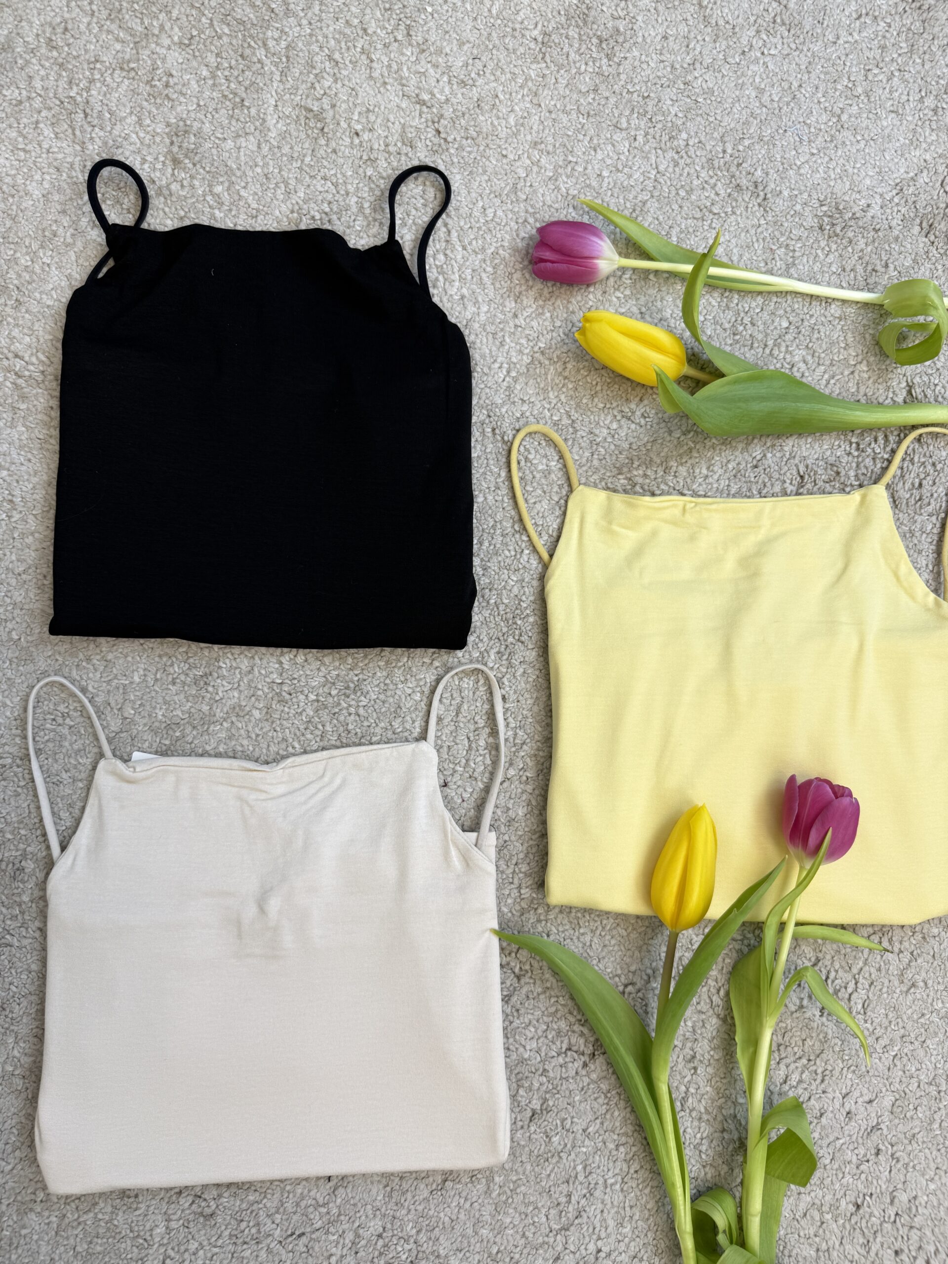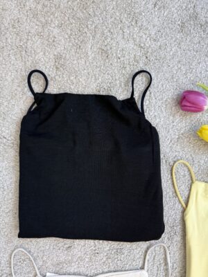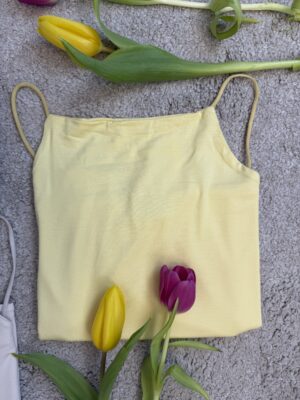 Top elasticizzato con spallini sottili e scollo quadrato, doppio tessuto.