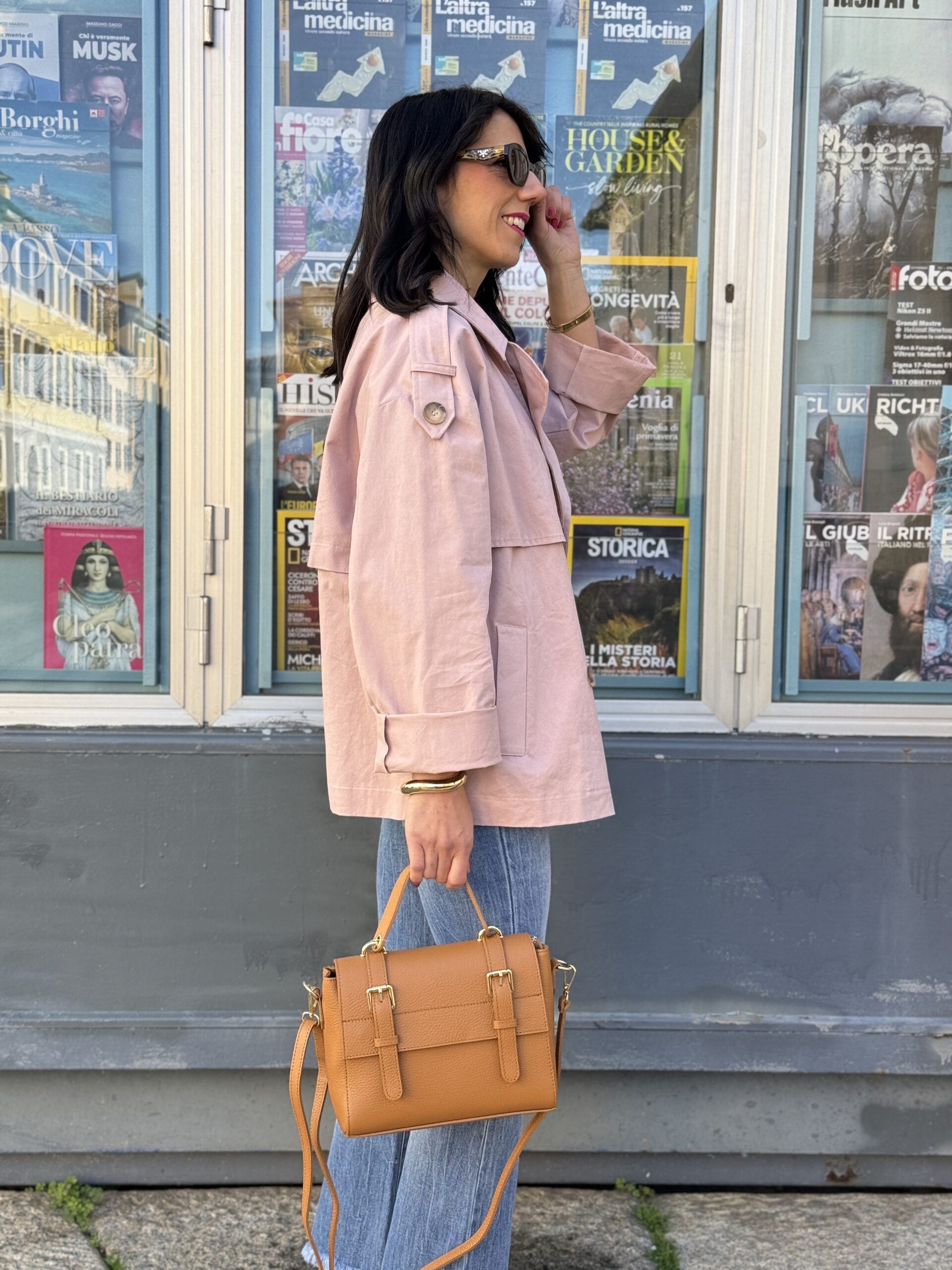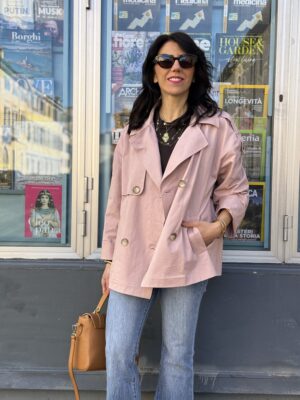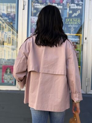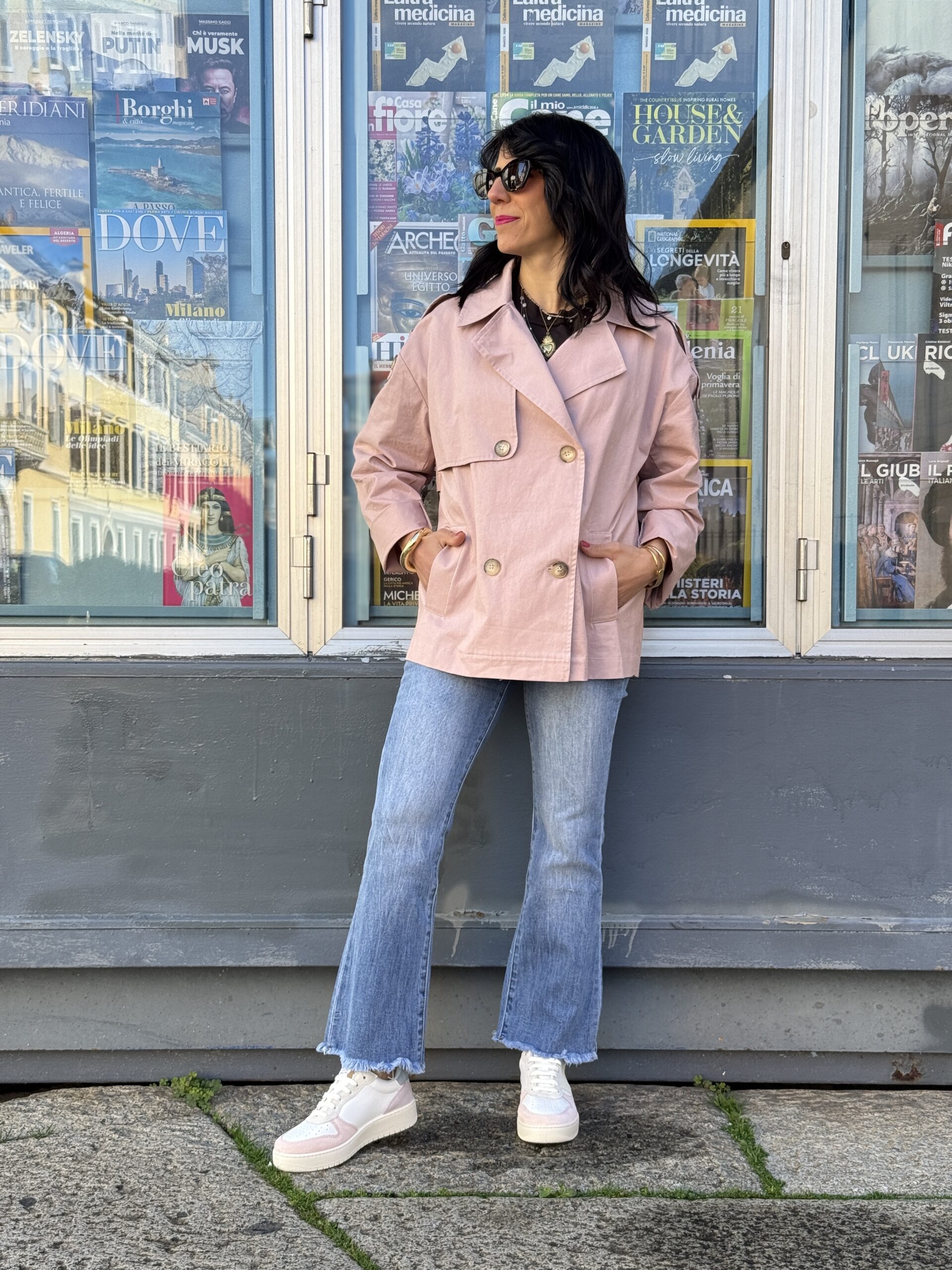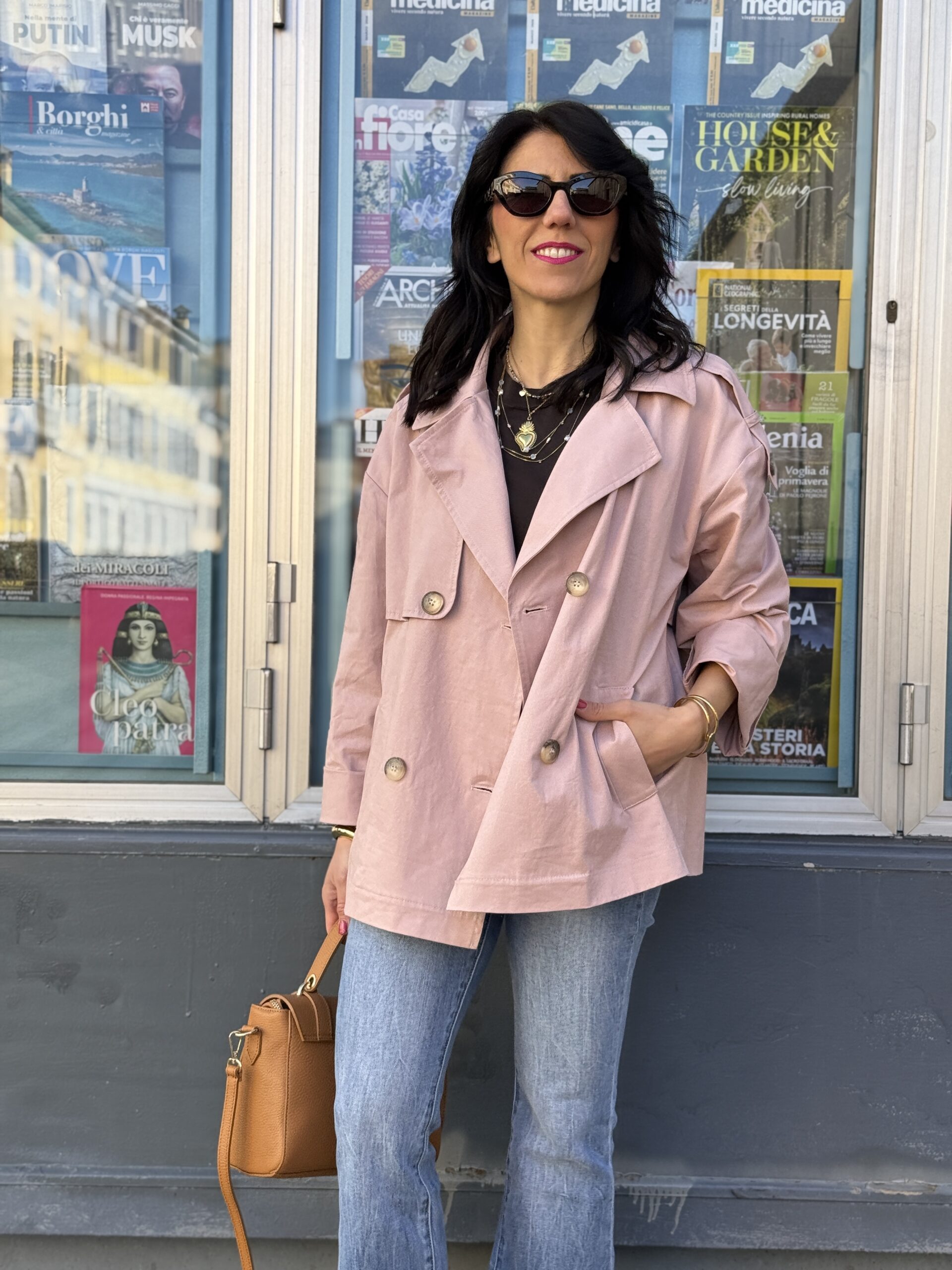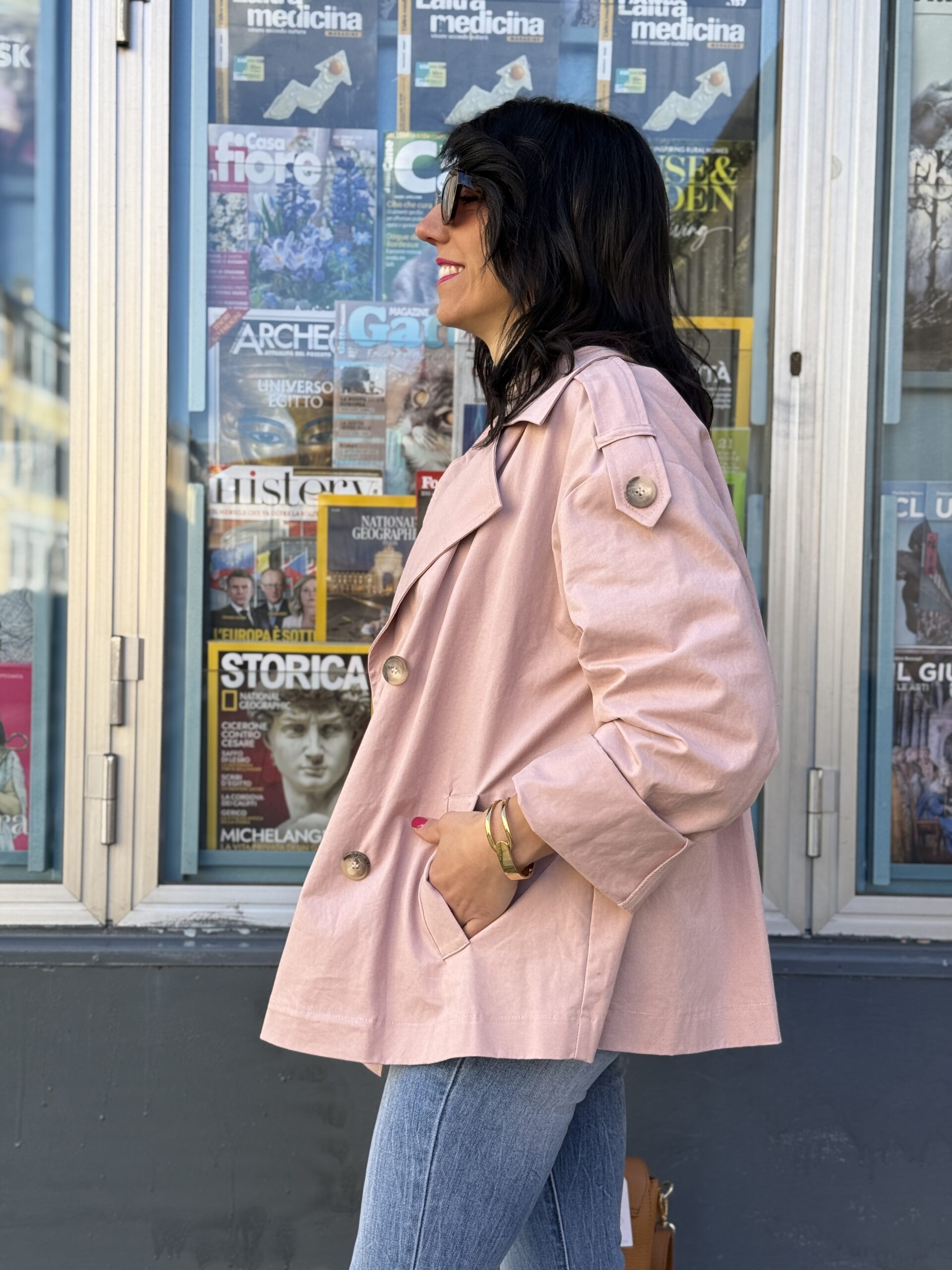 Trench corto doppio petto con mantellina posteriore e tasche davanti.