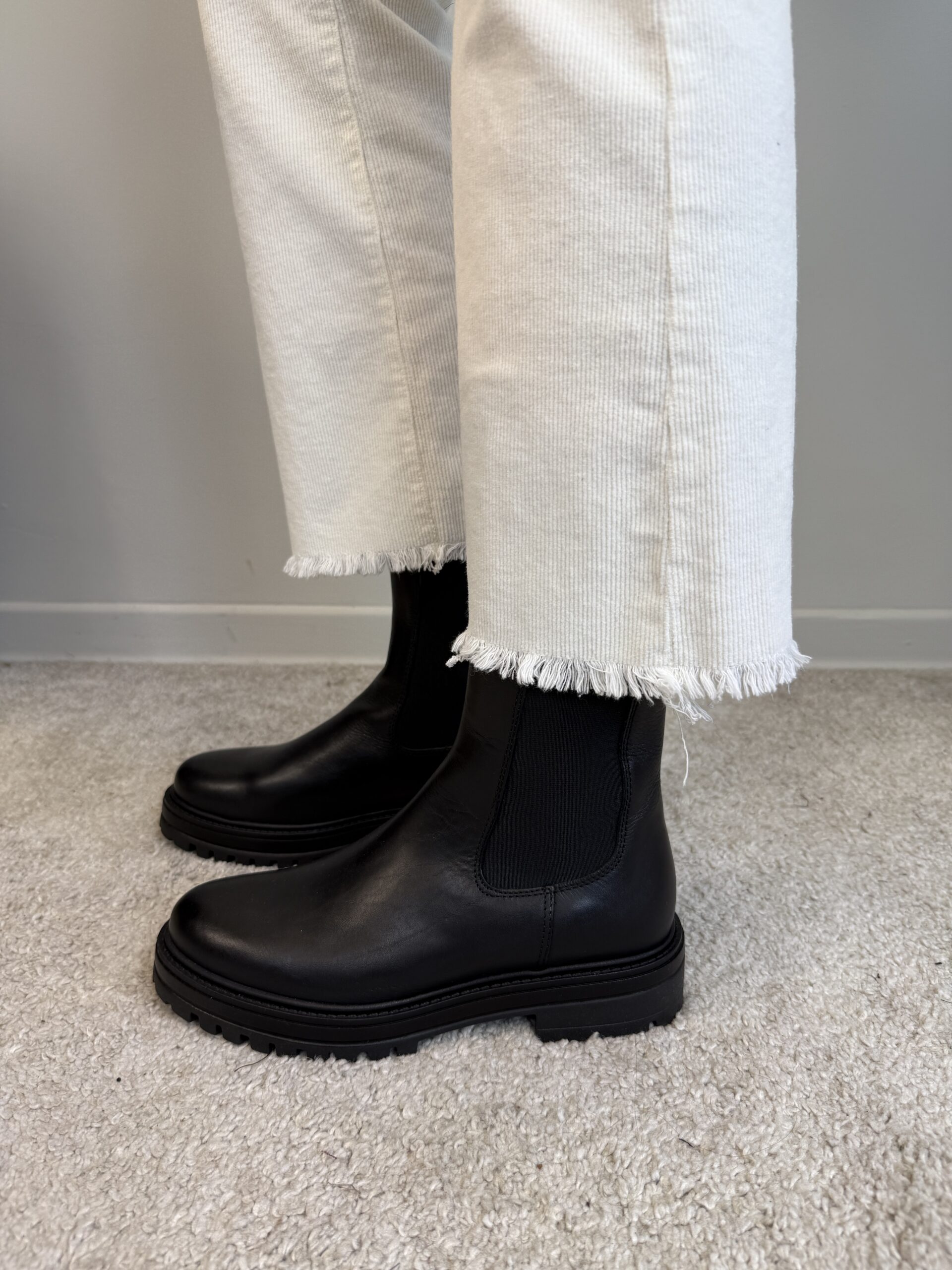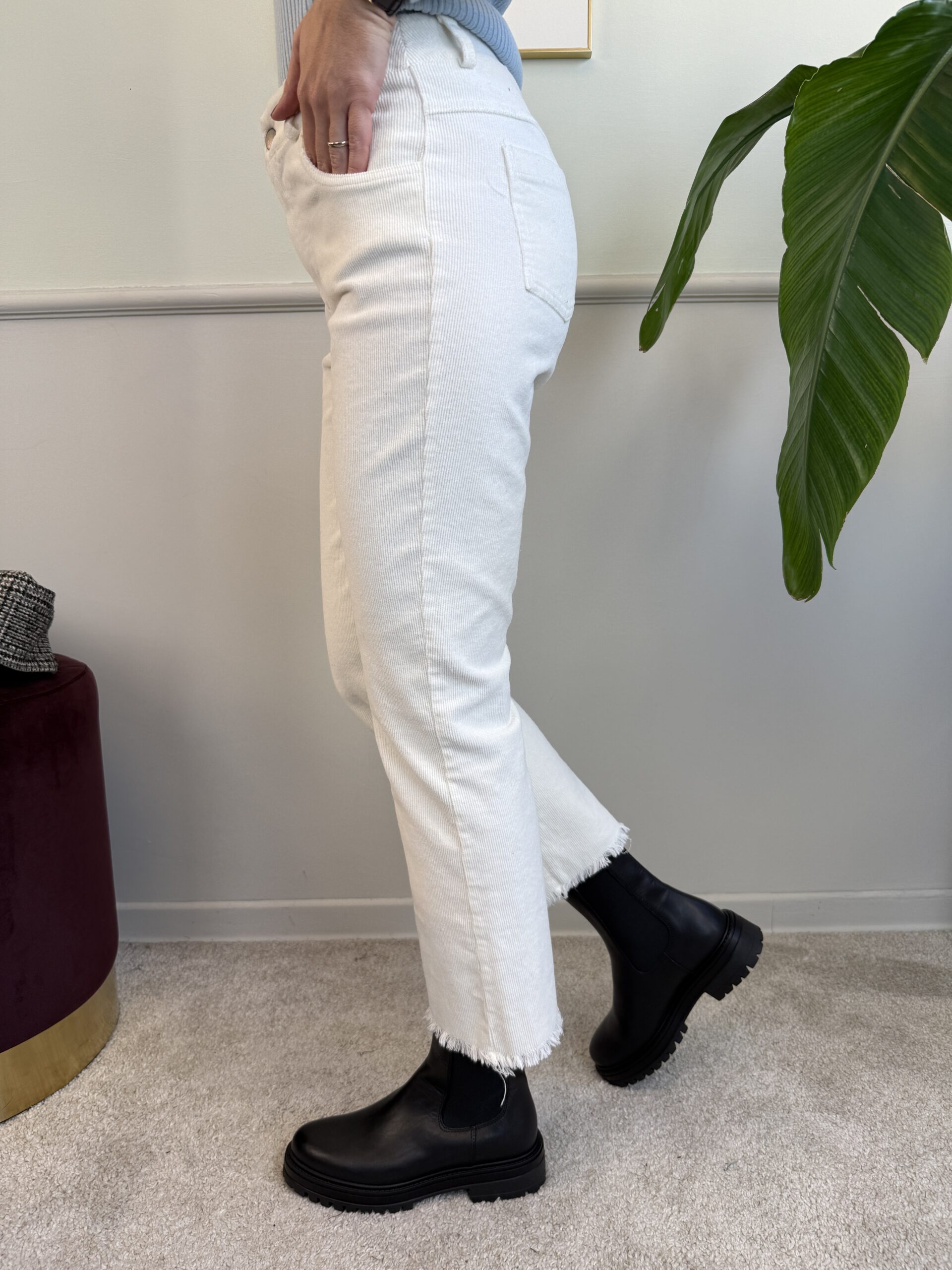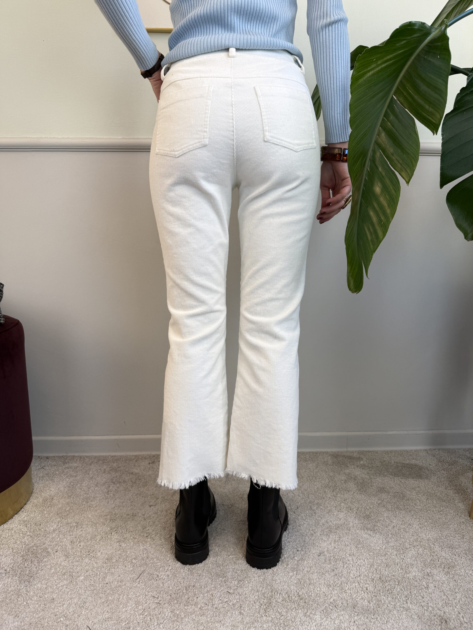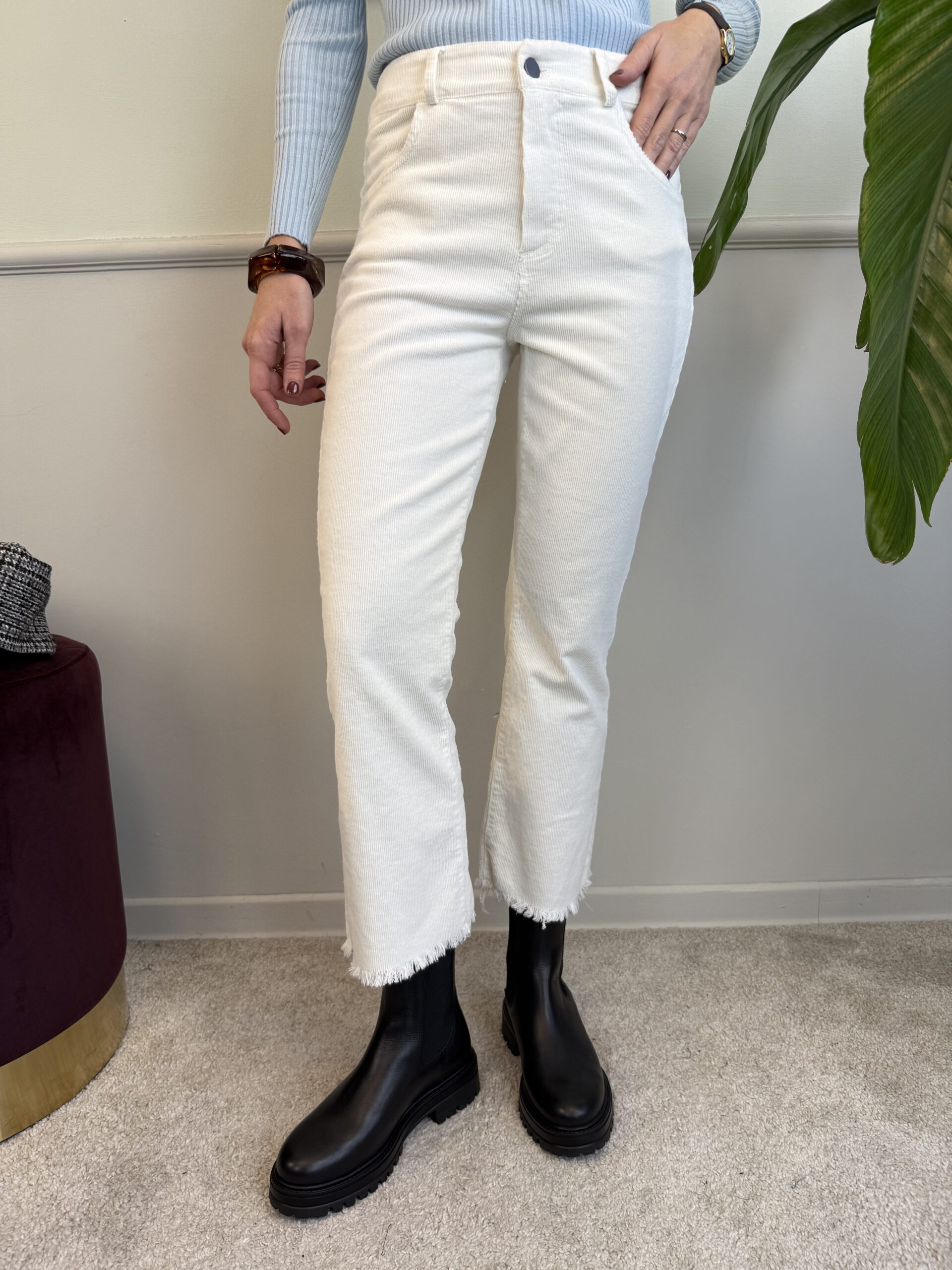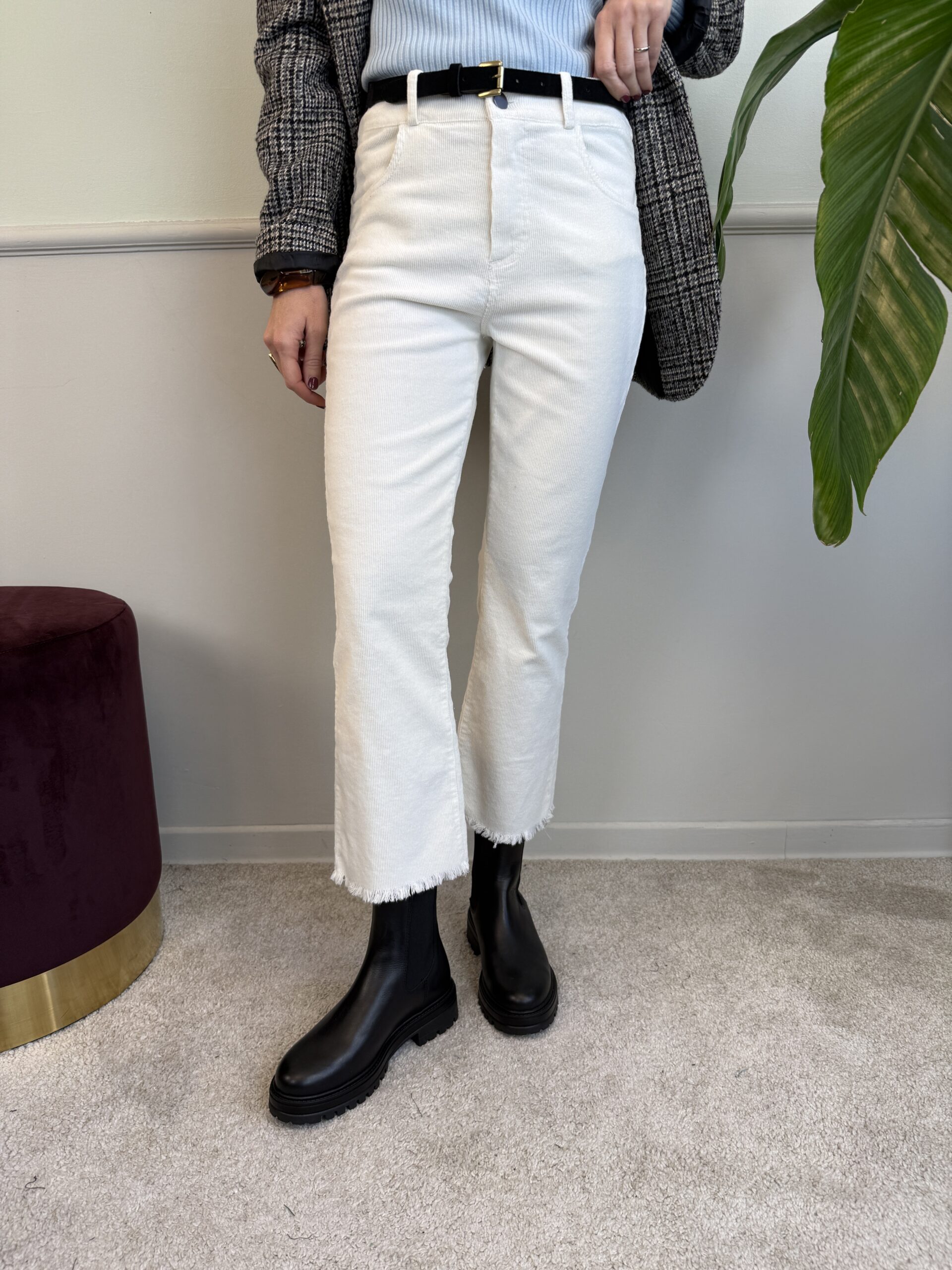 Trombetta in velluto mille righe a vita alta con orlo sfrangiato.