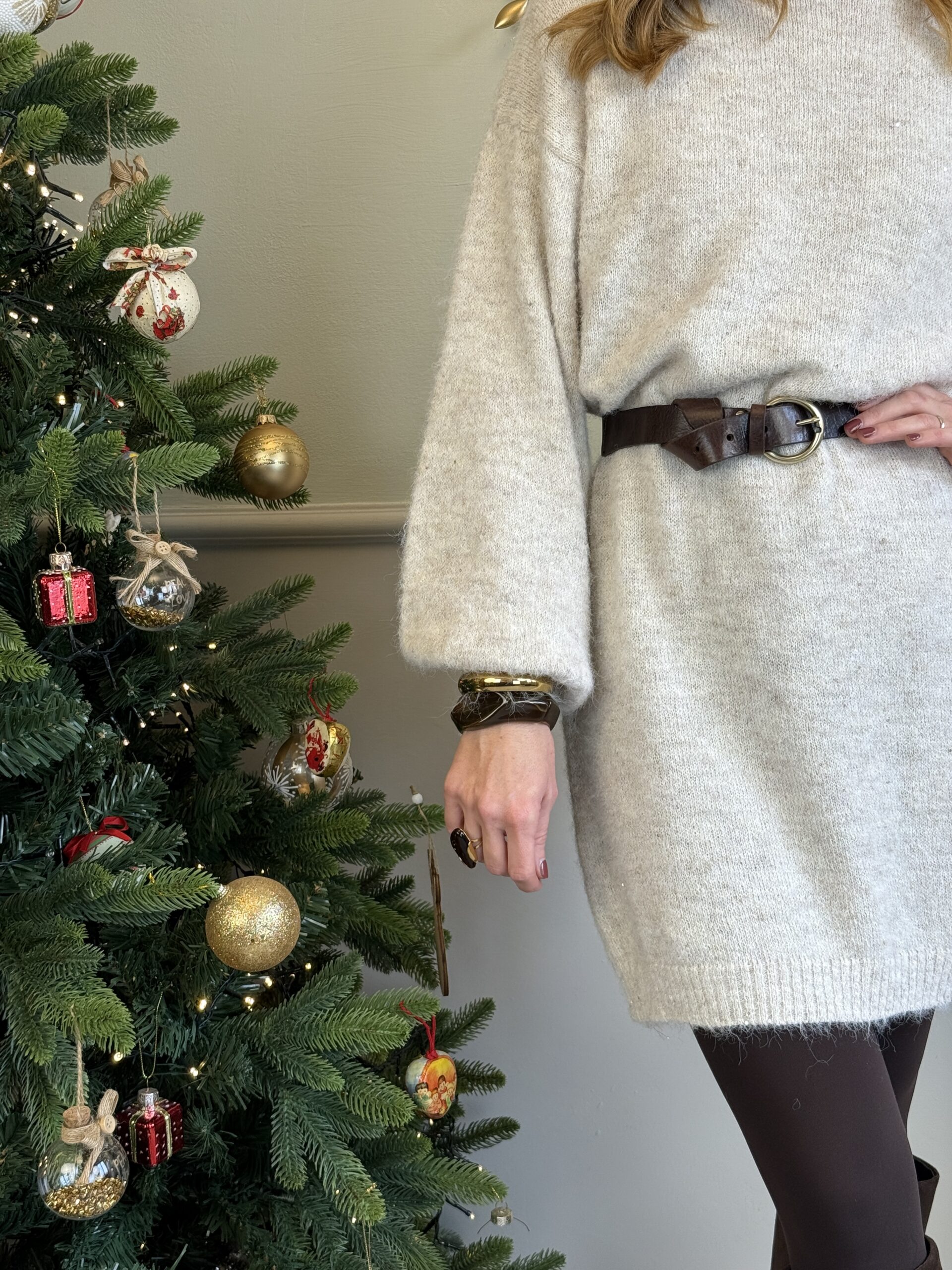 Vestito in maglia sopra al ginocchio a manica lunga. Colorazione beige mélange con filo lurex oro e micro paillettes oro.