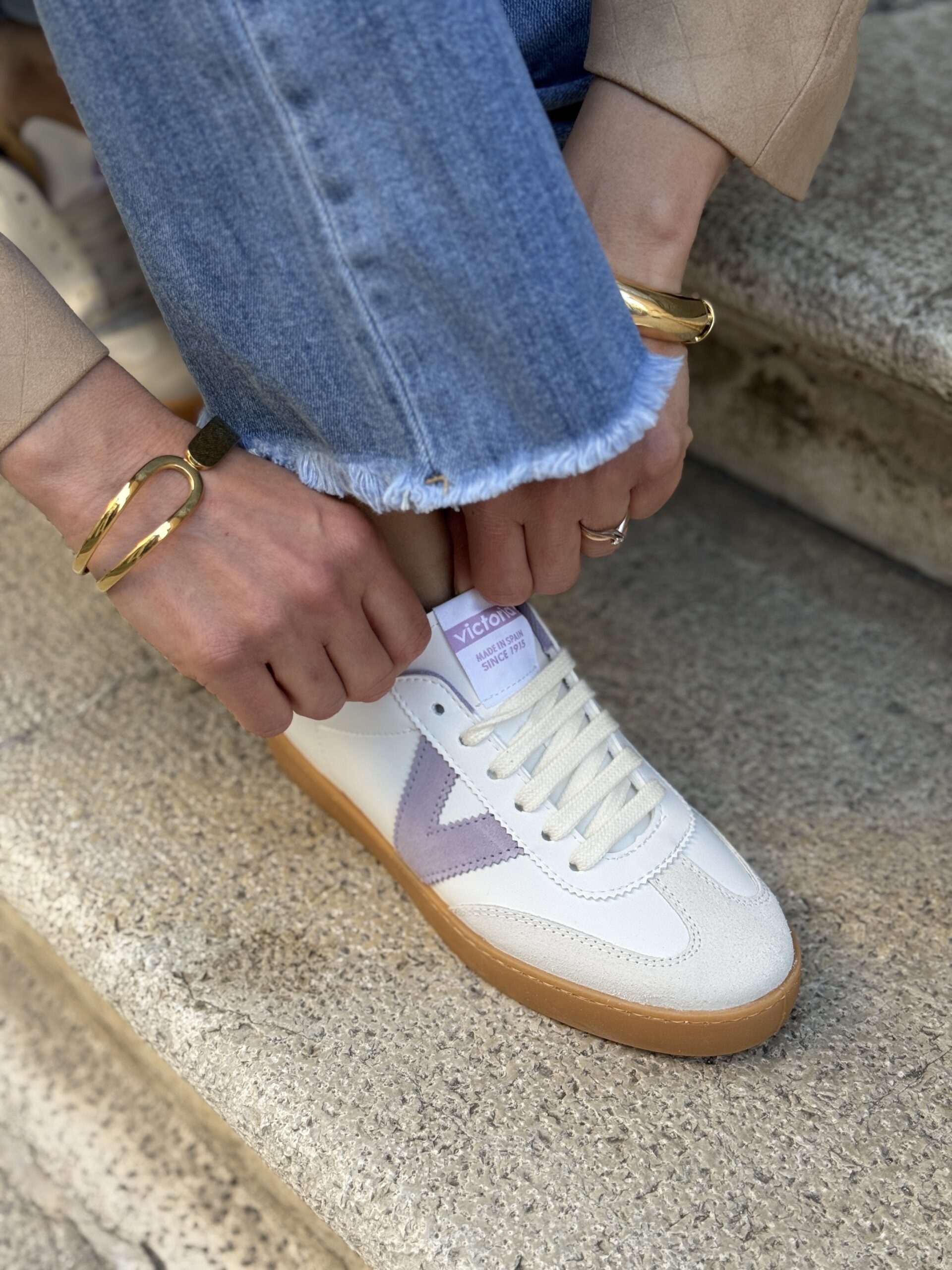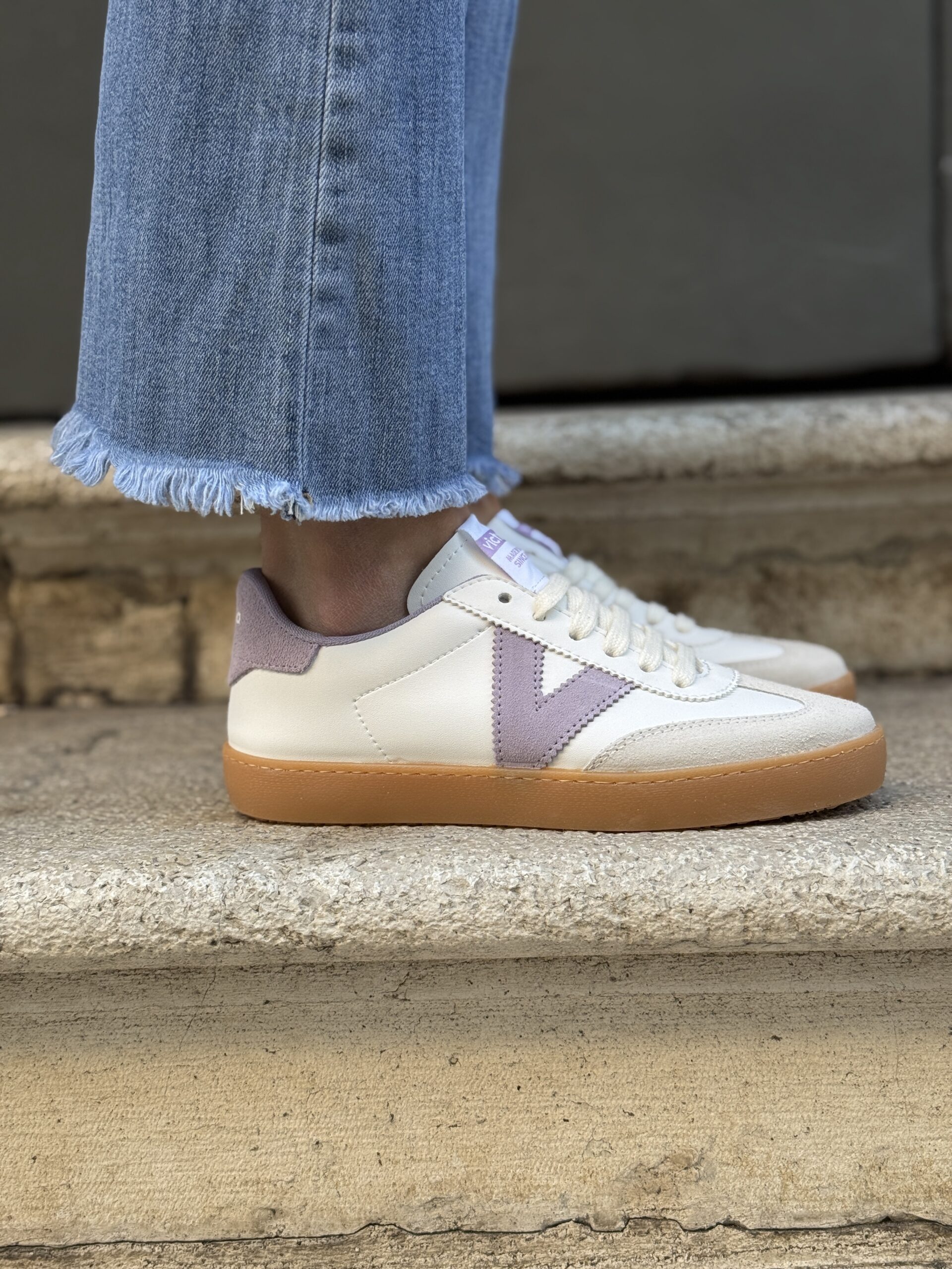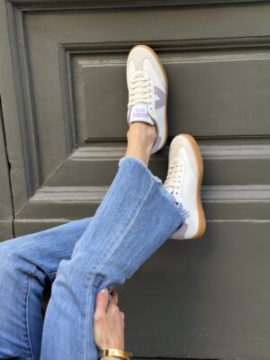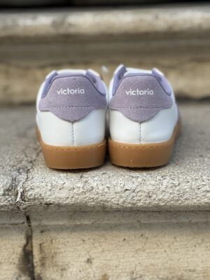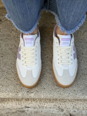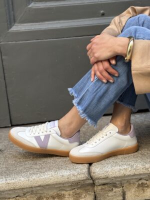 Scarpe per donna realizzate in Spagna in effetto pelle bianca con dettagli in camoscio. V laterale di victoria lilla, fodera e dettaglio posteriore lilla. Suola in T.R. traslucido color ambrato. Soletta interna in materiali riciclati.