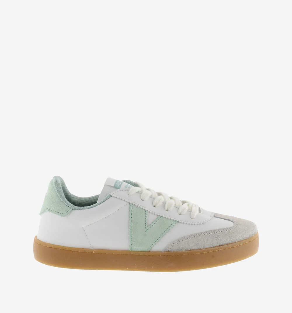 Scarpe per donna realizzate in Spagna in effetto pelle bianca con dettagli in camoscio. V laterale di victoria verde menta, fodera e dettaglio posteriore verde menta. Suola in T.R. traslucido color ambrato. Soletta interna in materiali riciclati.
