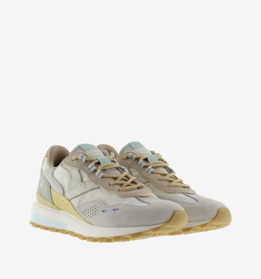 Realizzate in nylon con dettagli multicolore sovrapposti in camoscio e materiali sintetici. Patch in gomma con il logo del marchio sulla linguetta. Chiusura con lacci tono su tono di tipo rotondo. Comoda suola in phylon con battistrada in TPR in rilievo tono su tono e stabilizzatore sul tallone. Soletta estraibile.