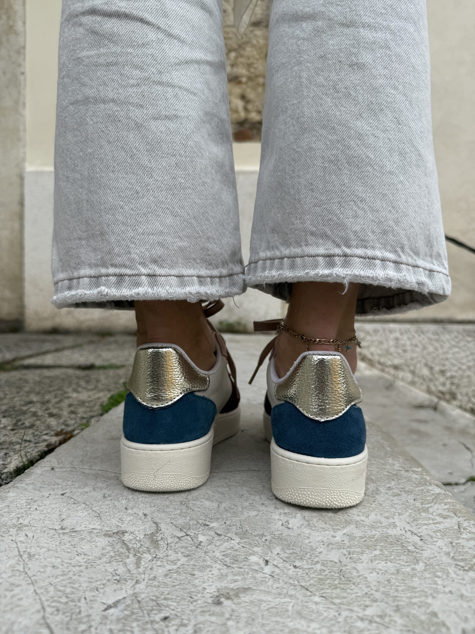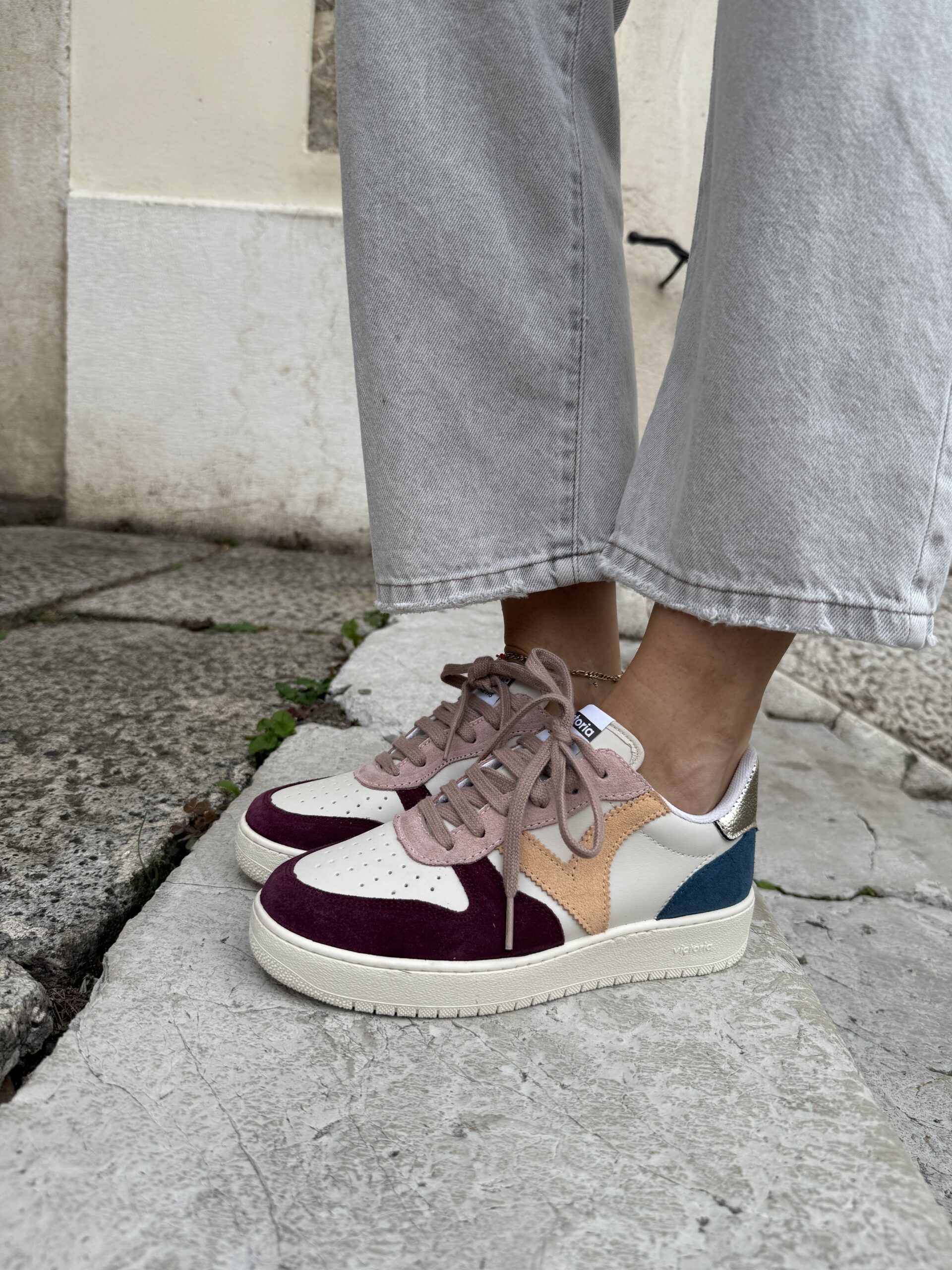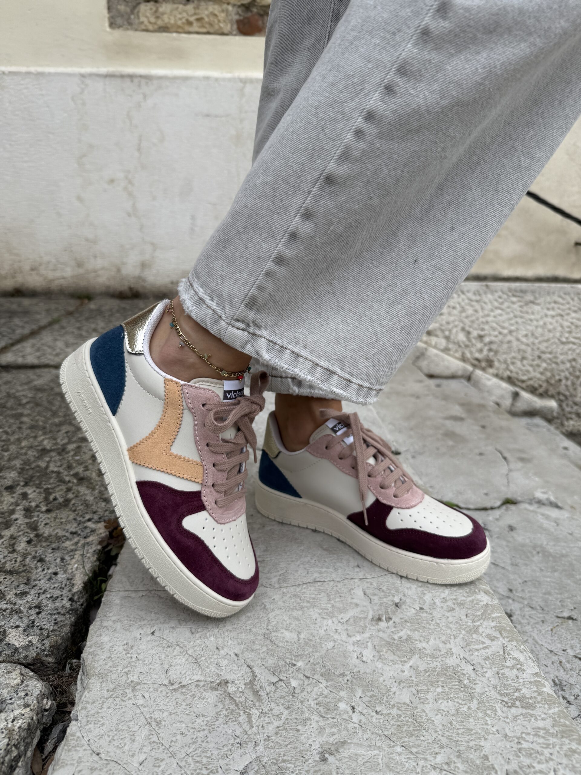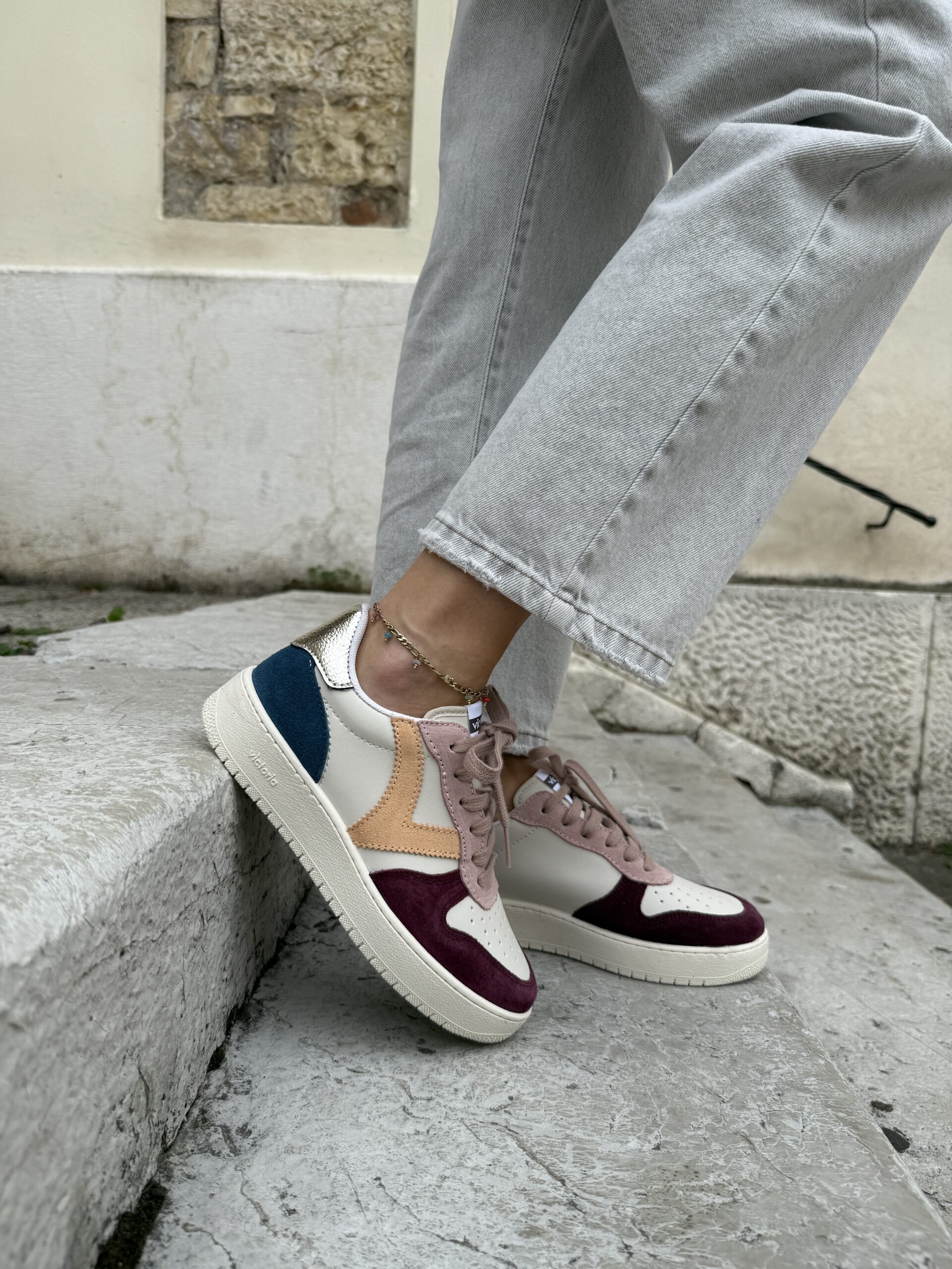Sneakers da donna realizzate in Spagna in materiale effetto pelle e inserti in crosta di pelle multicolore.