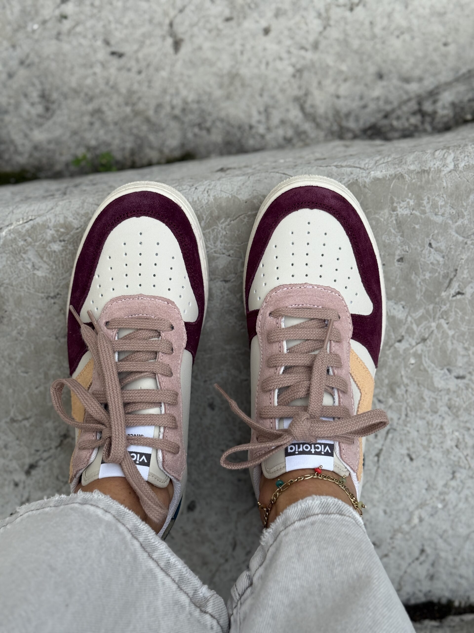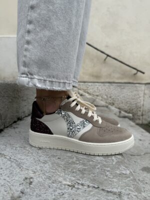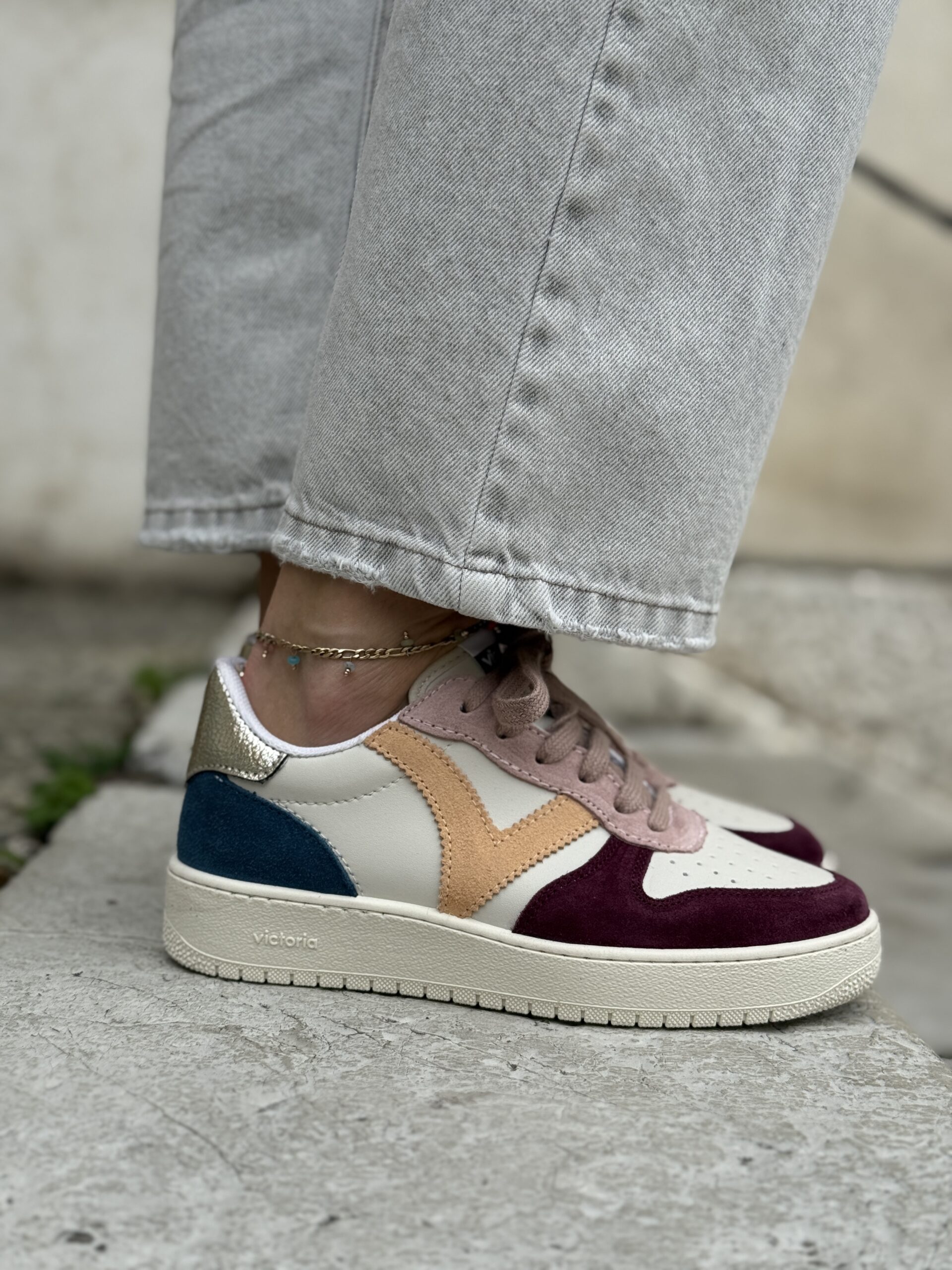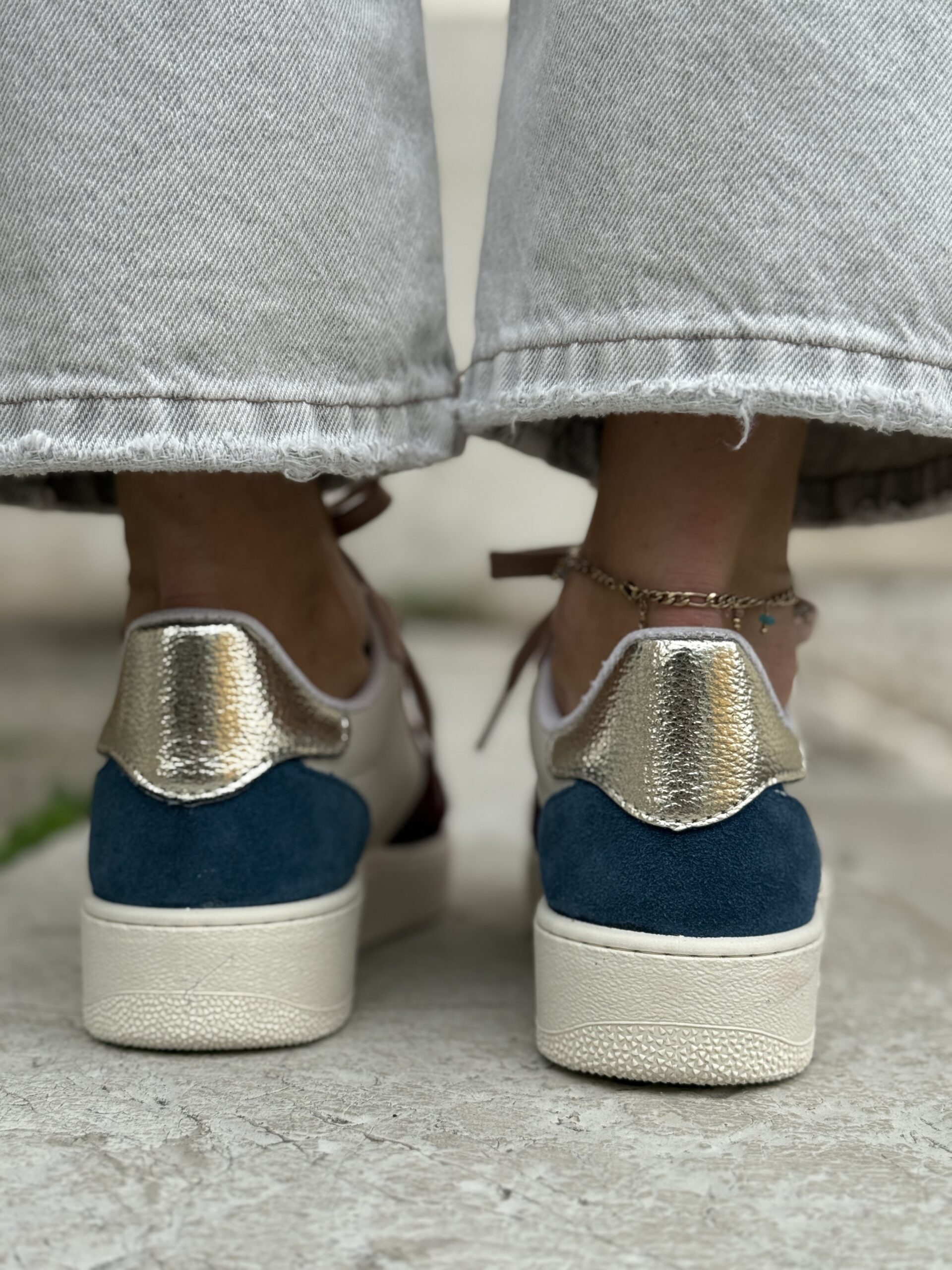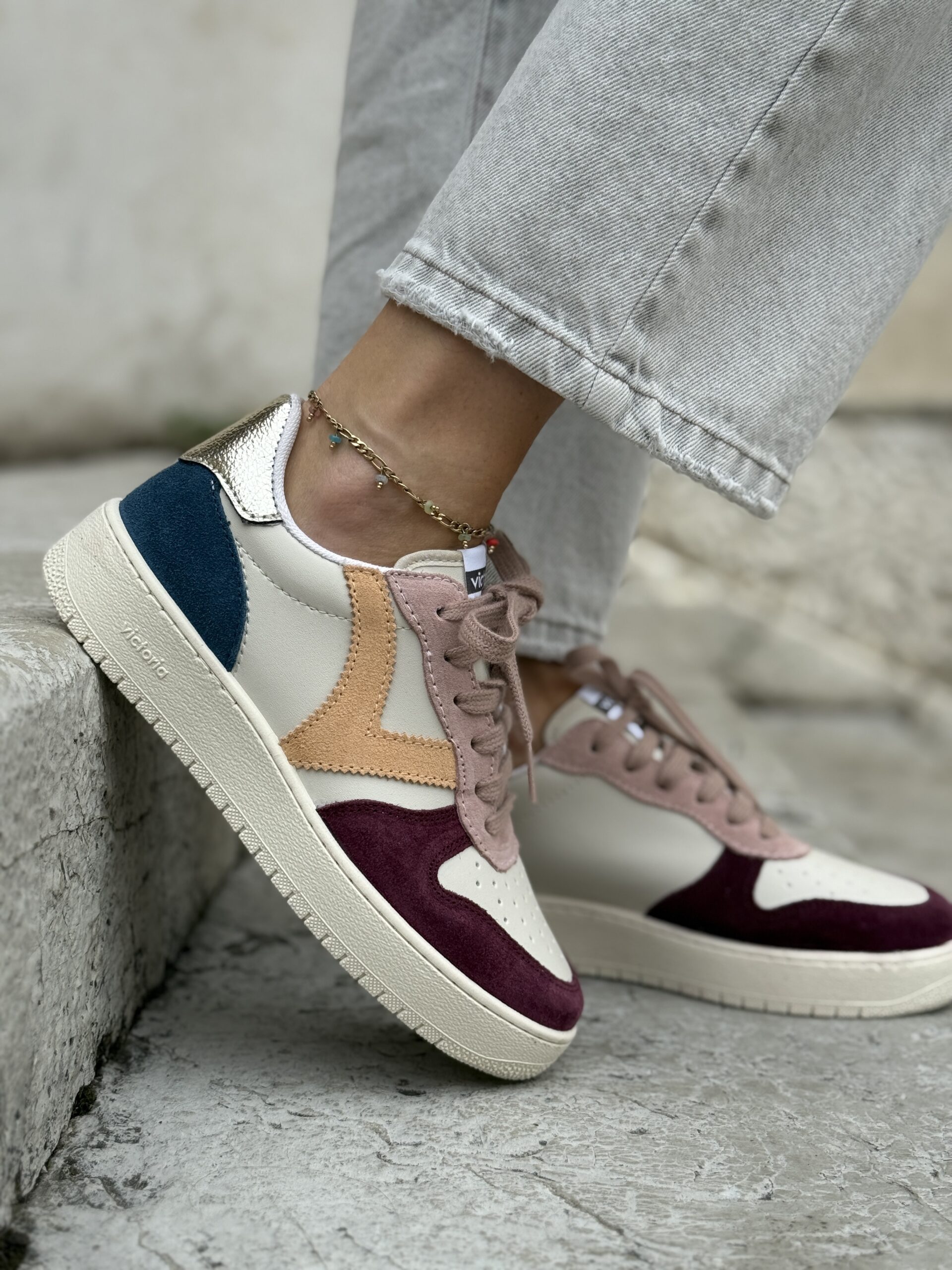 Sneakers da donna realizzate in Spagna in materiale effetto pelle e inserti in crosta di pelle multicolore.