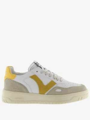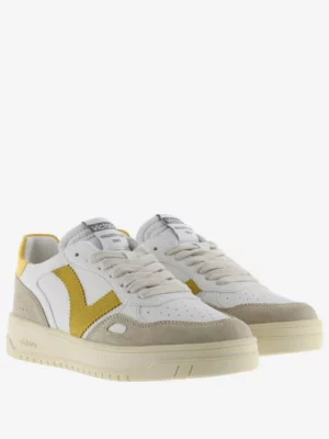 Scarpe sportive da donna prodotte in Spagna in effetto pelle bianca con inserti multicolore in camoscio. Tomaia traforata per favorire la traspirazione. Suola in PVC con materiale riciclato, leggermente ambrata. Sottopiede estraibile e lavabile