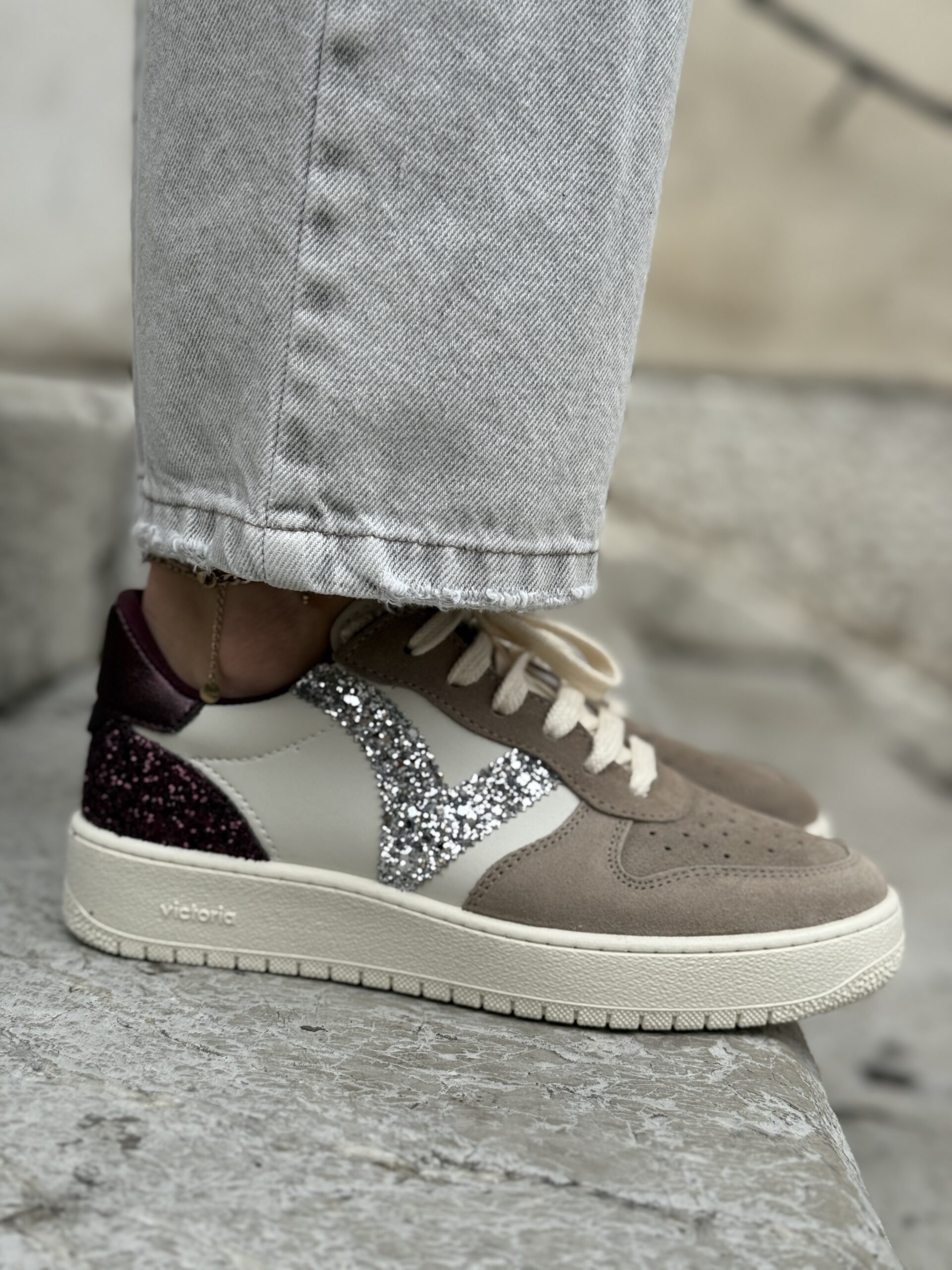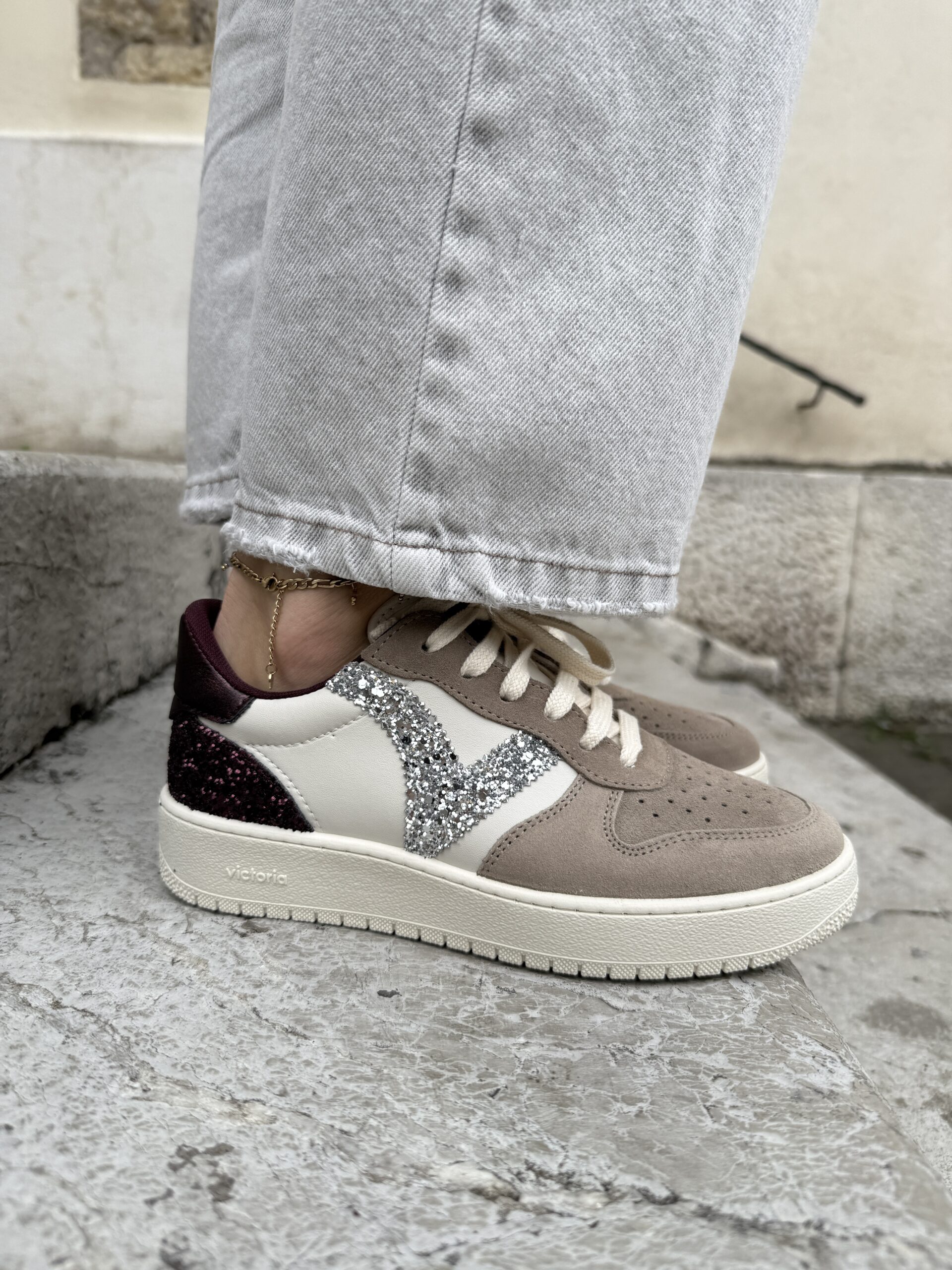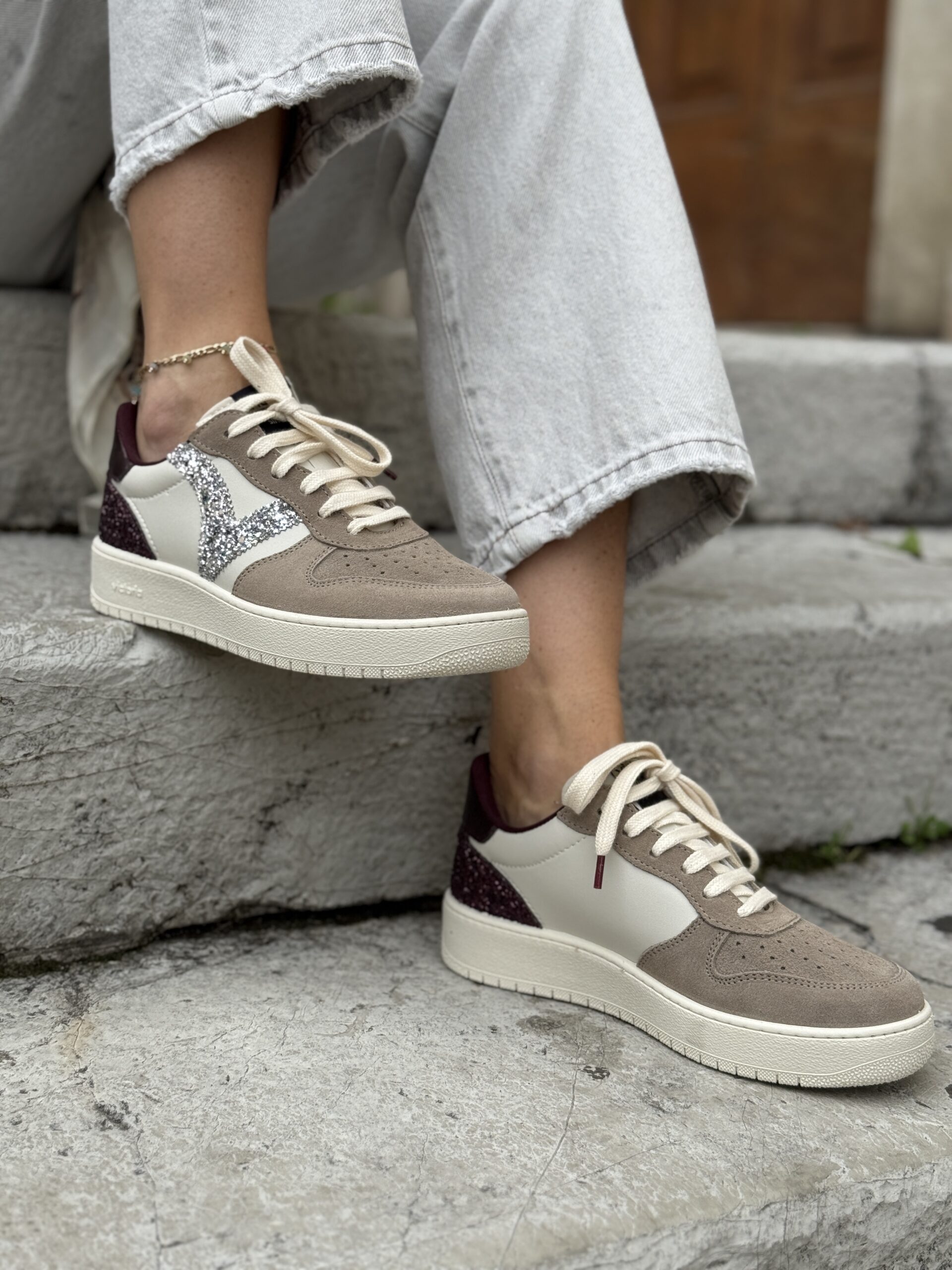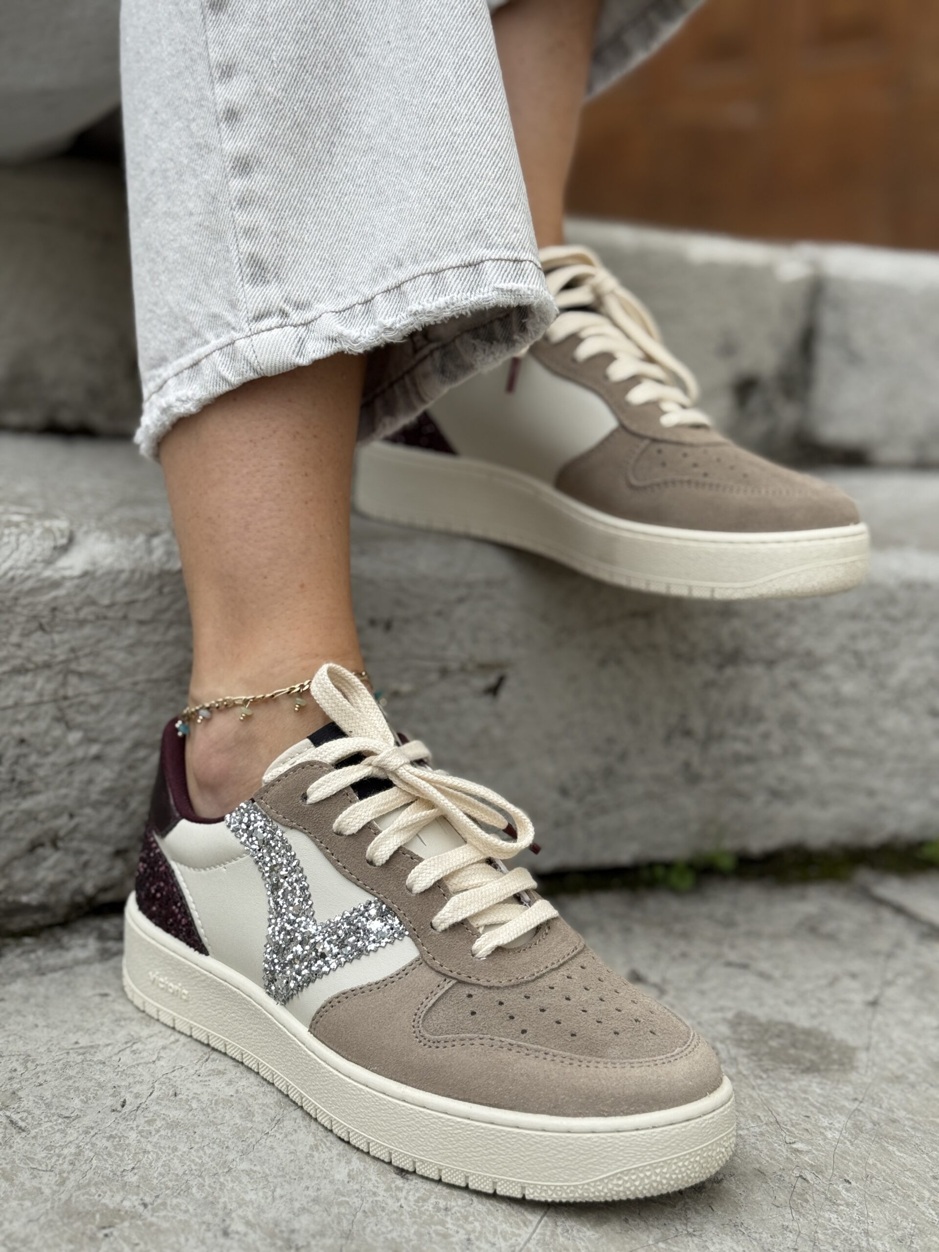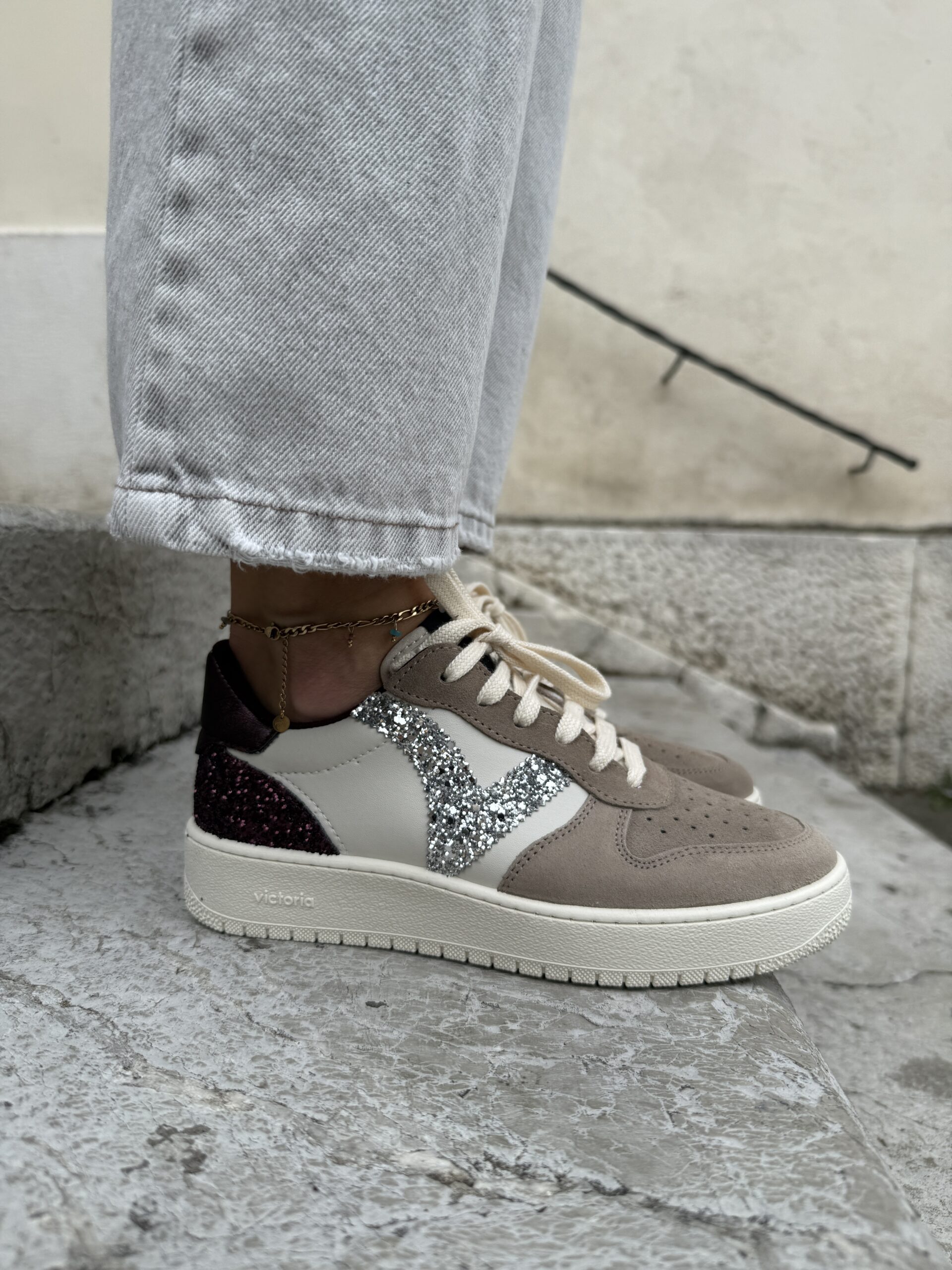 Sneakers sportive da donna realizzate in Spagna in materiale effetto pelle con inserti in crosta di pelle. V laterale in glitter e dettaglio metallizzato sull’inserto posteriore. Un altro inserto posteriore è anch’esso in glitter. Suola di 3 cm composta da oli vegetali invece che minerali, riducendo così l’impatto ambientale. Sottopiede estraibile e lavabile. Leggere, comode e traspiranti.