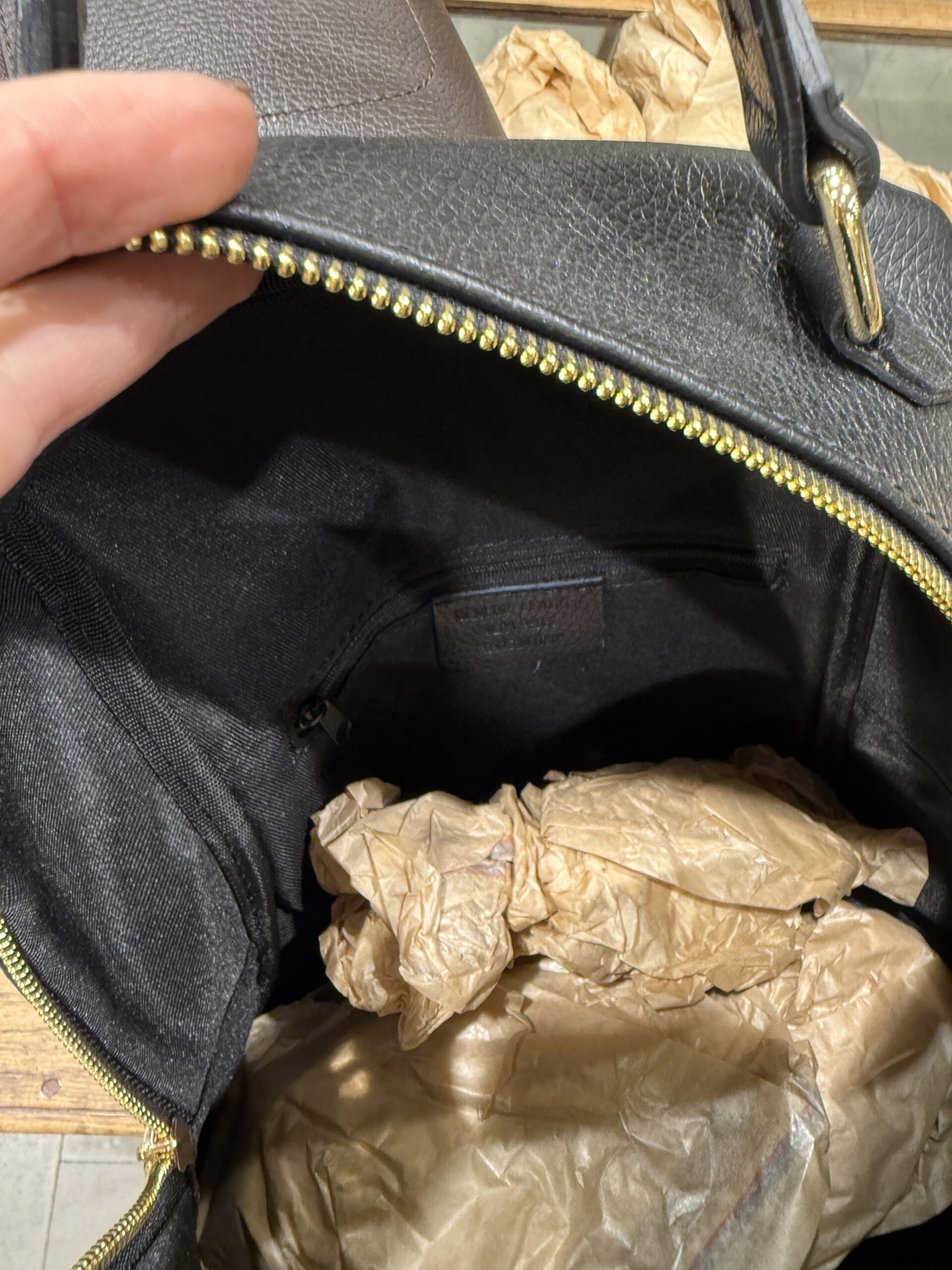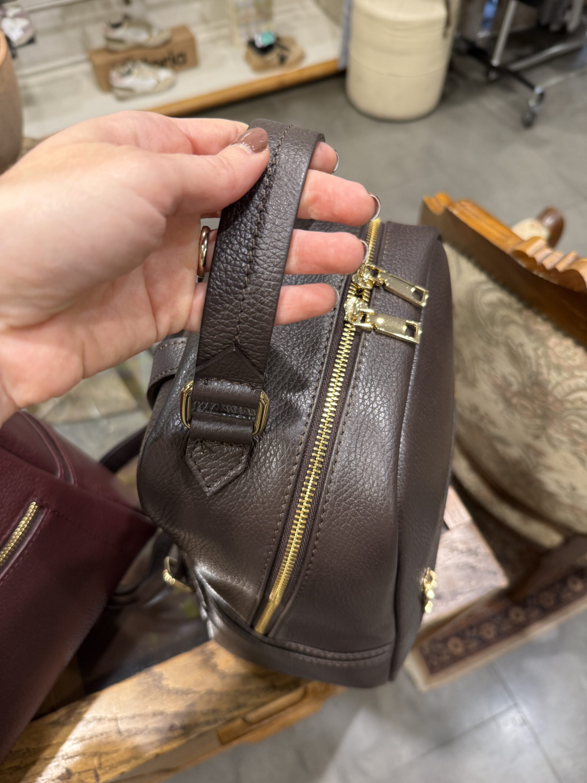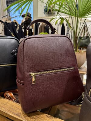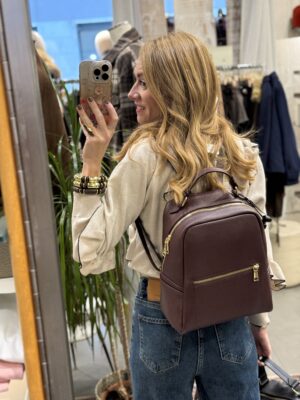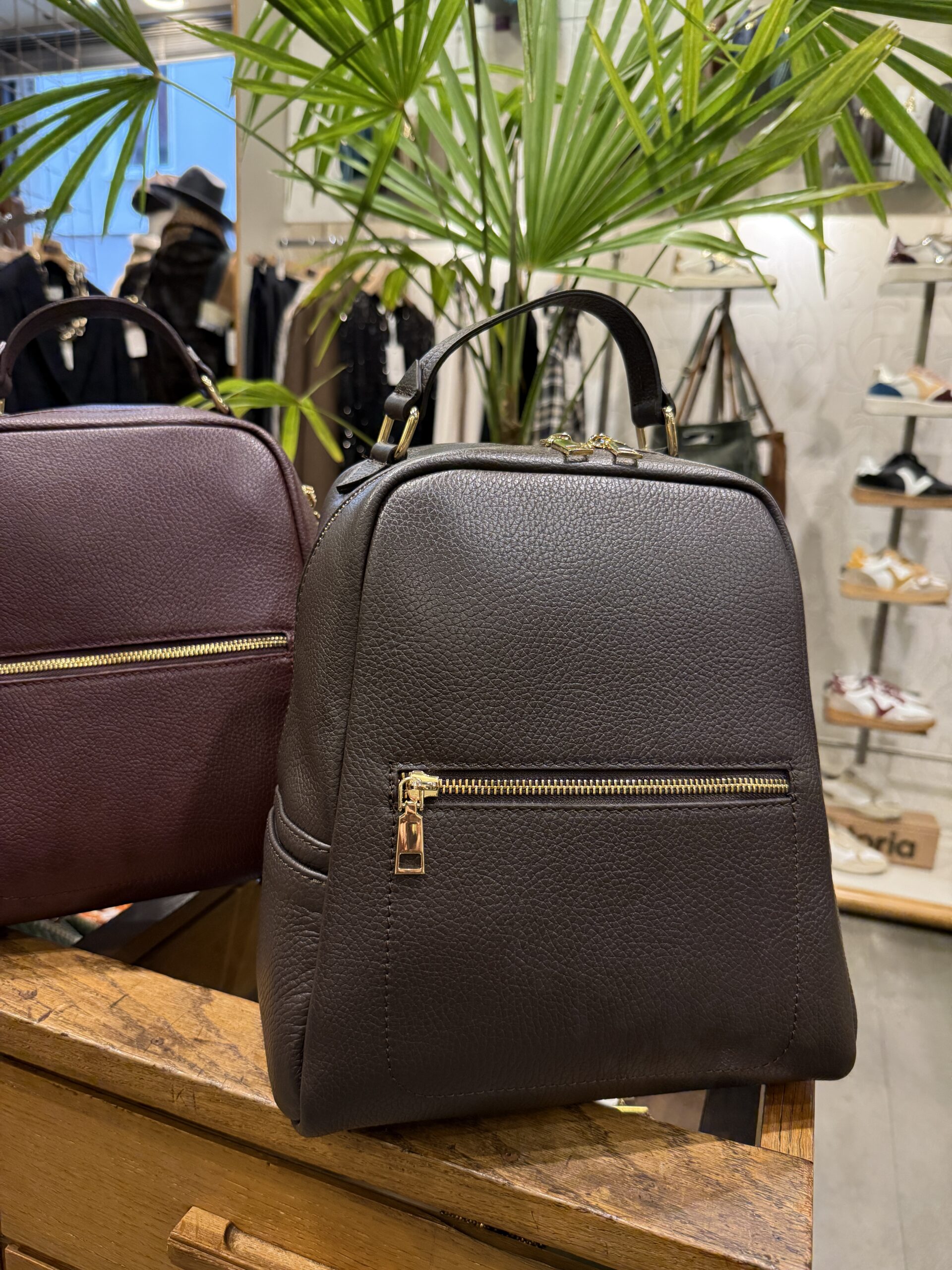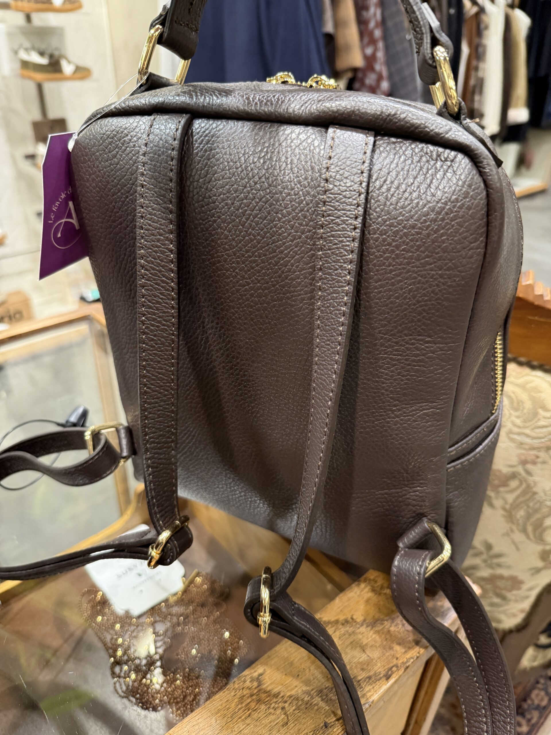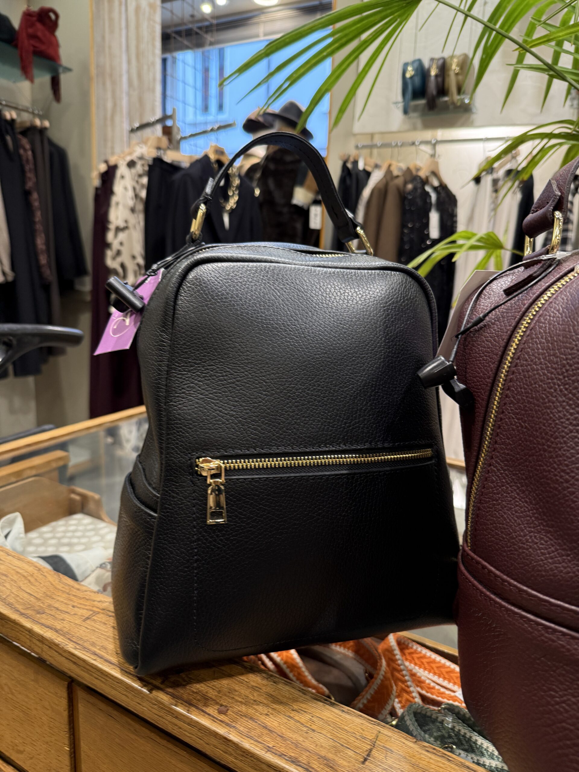 Zaino in pelle con spallini regolabili, interno foderato, tasca sul davanti, chiusura con zip dorata.